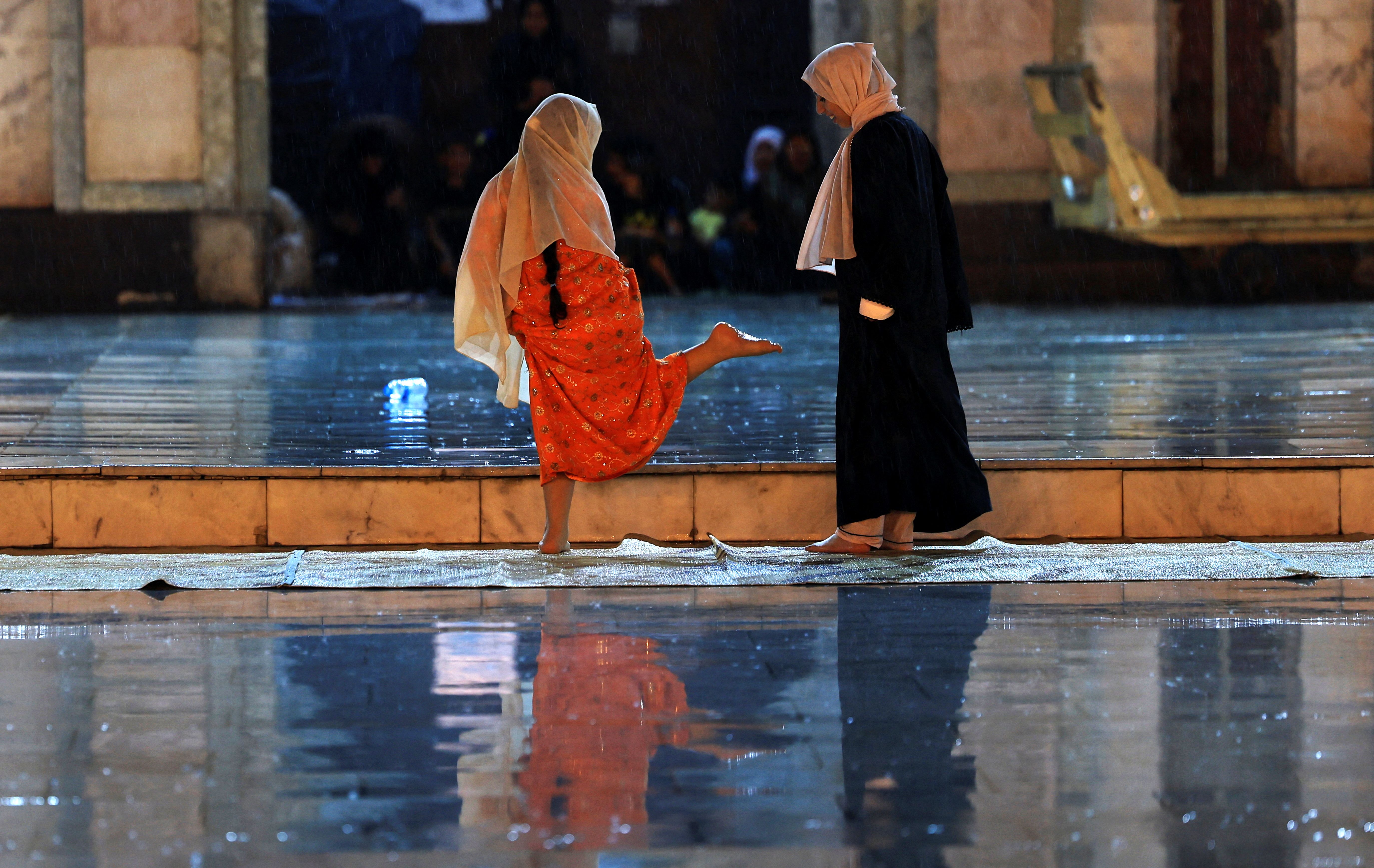 A Sunni Muslim child plays in the rain as she arrives for Eid al-Fitr prayers at the shrine of cleric Sheikh Abdul Qadir al-Gailani in Baghdad, Iraq on March 31, 2025. (Photo by Thaier Al-Sudani/Reuters)