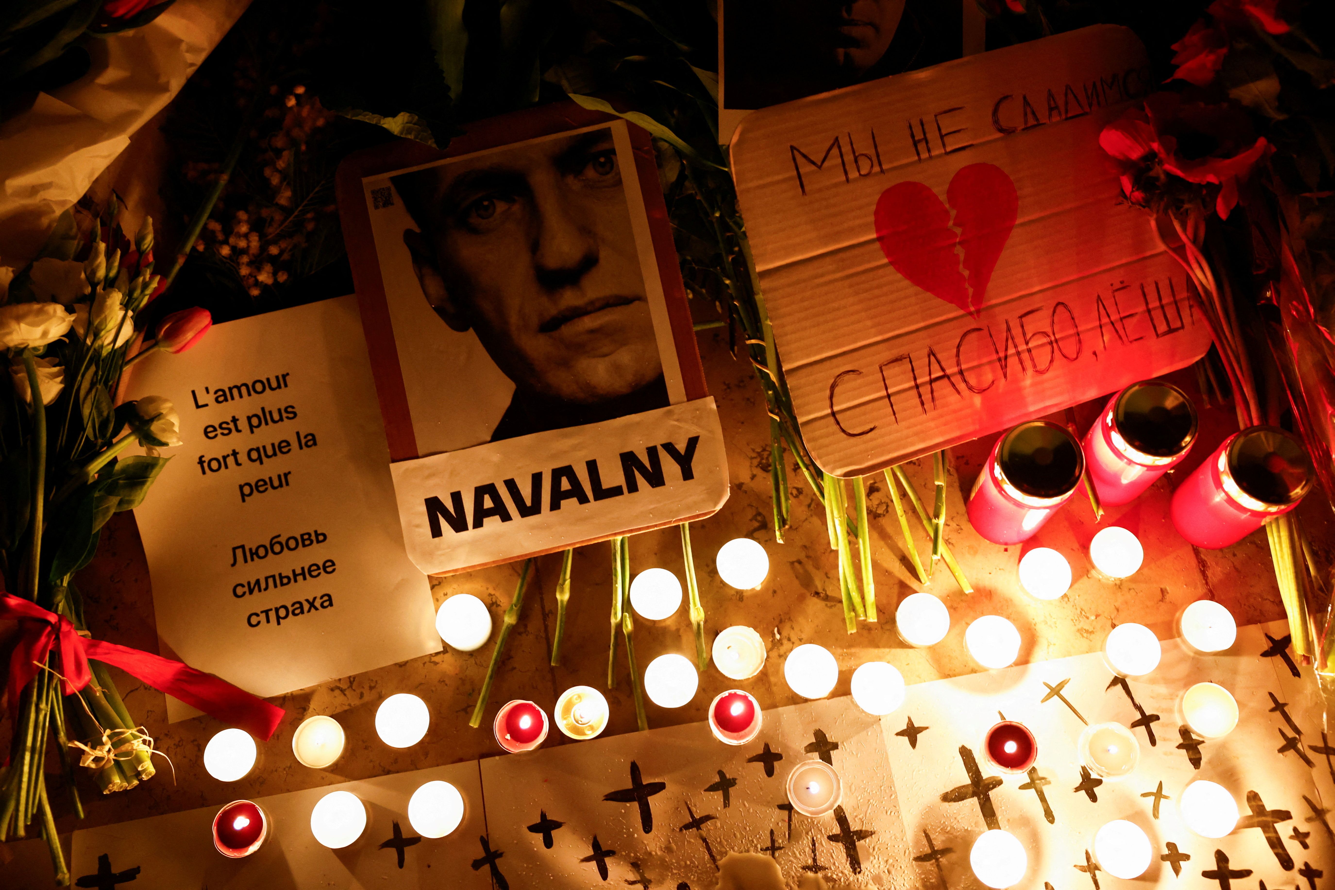 Candles, flowers, a picture of Russian opposition leader Alexei Navalny, and a sheet of paper that reads: “Love is stronger than fear”, lie on the ground, at the the Trocadero near the Eiffel Tower in Paris, France, on February 17, 2024. (Photo by Sarah Meyssonnier/Reuters)