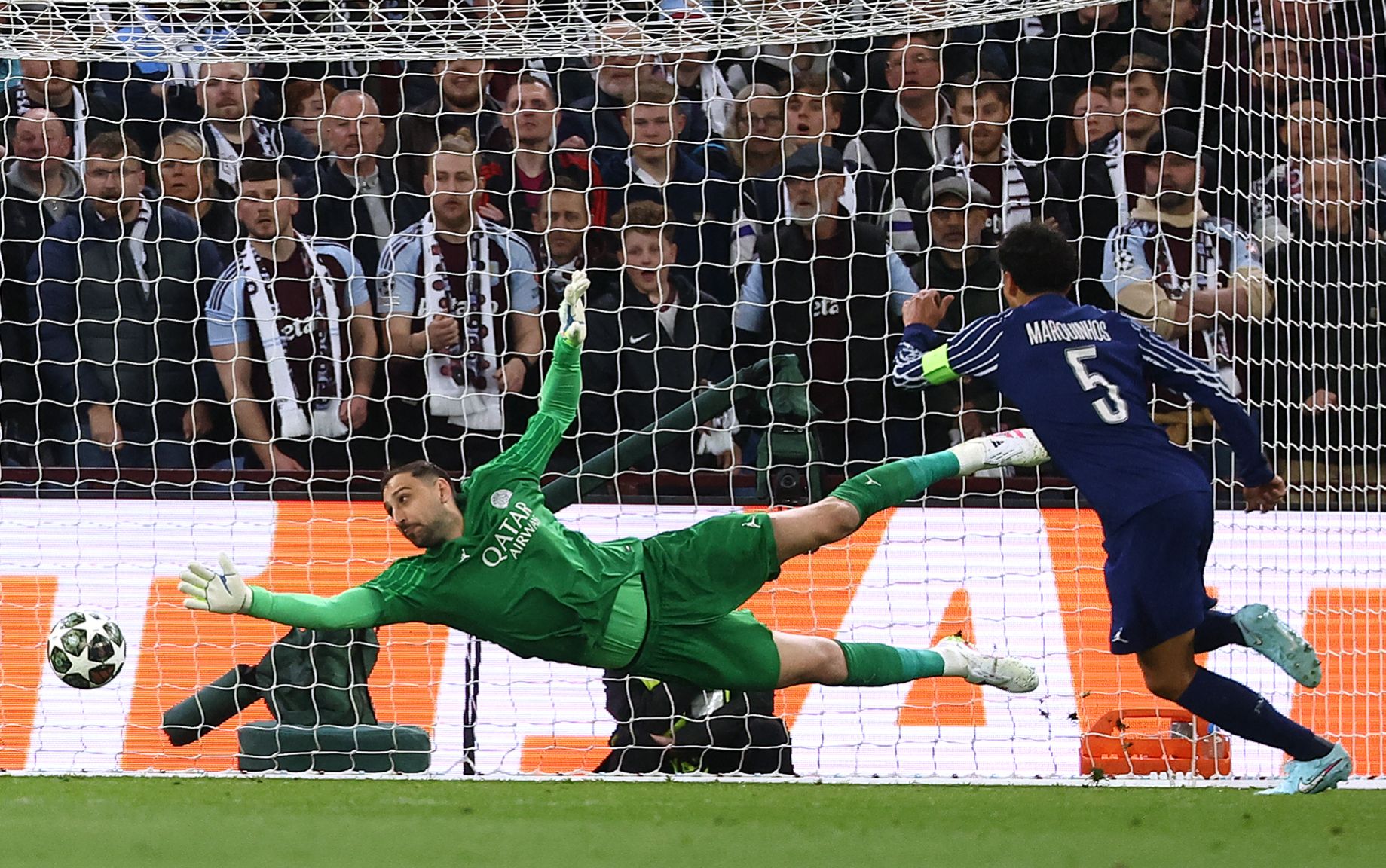 Paris Saint-Germain's Italian goalkeeper #99 Gianluigi Donnarumma jumps for the ball during the UEFA Champions League quarter-final second-leg football match between Aston Villa and Paris Saint-Germain at Villa Park in Birmingham, central England on April 15, 2025. (Photo by Franck Fife/AFP Photo)