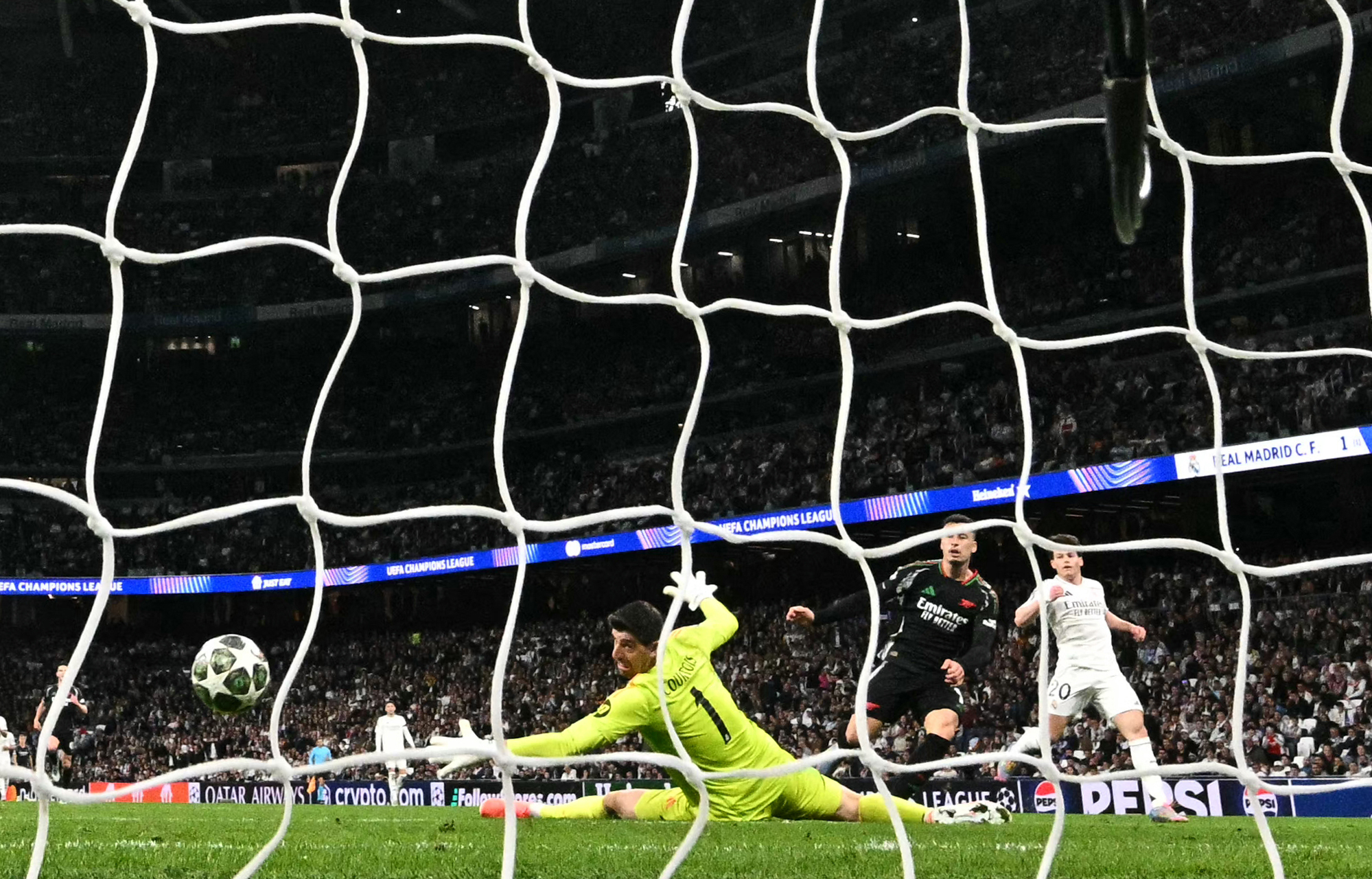 Arsenal's Brazilian midfielder #11 Gabriel Martinelli (2R) scores his team's second goal in spite of Real Madrid's Belgian goalkeeper #01 Thibaut Courtois during the UEFA Champions League quarter final second leg football match between Real Madrid CF and Arsenal at Santiago Bernabeu Stadium in Madrid on April 16, 2025. (Photo by Javier Soriano/AFP Photo)