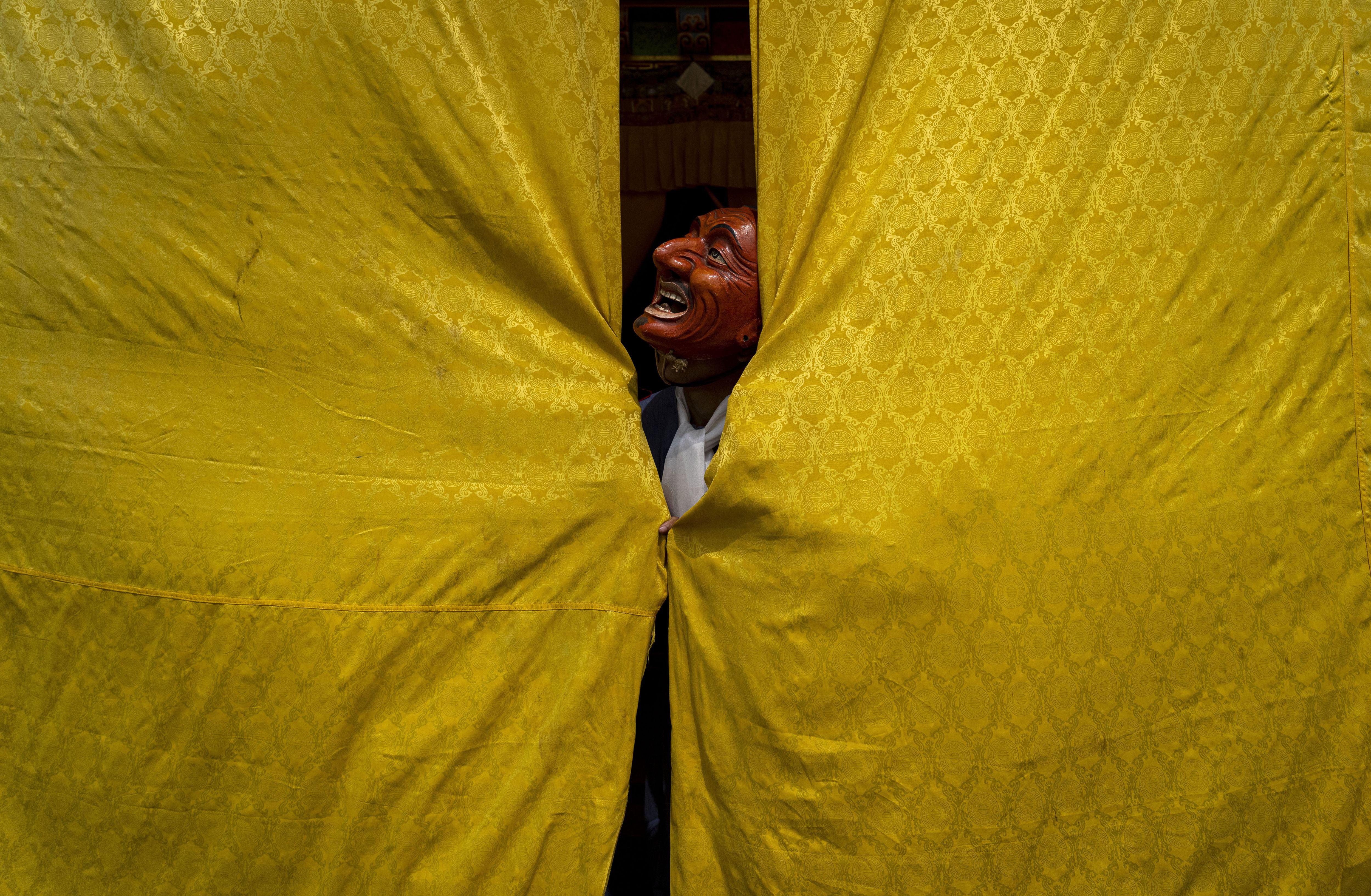 A masked monk stands behind a curtain, assisting a dancer in preparing for a traditional performance during Gyalpo Losar, the Sherpa community's New Year celebration, at Shechen Monastery in Kathmandu, Nepal, on Tuesday, February 25, 2025. (Photo by Niranjan Shrestha/AP Photo)