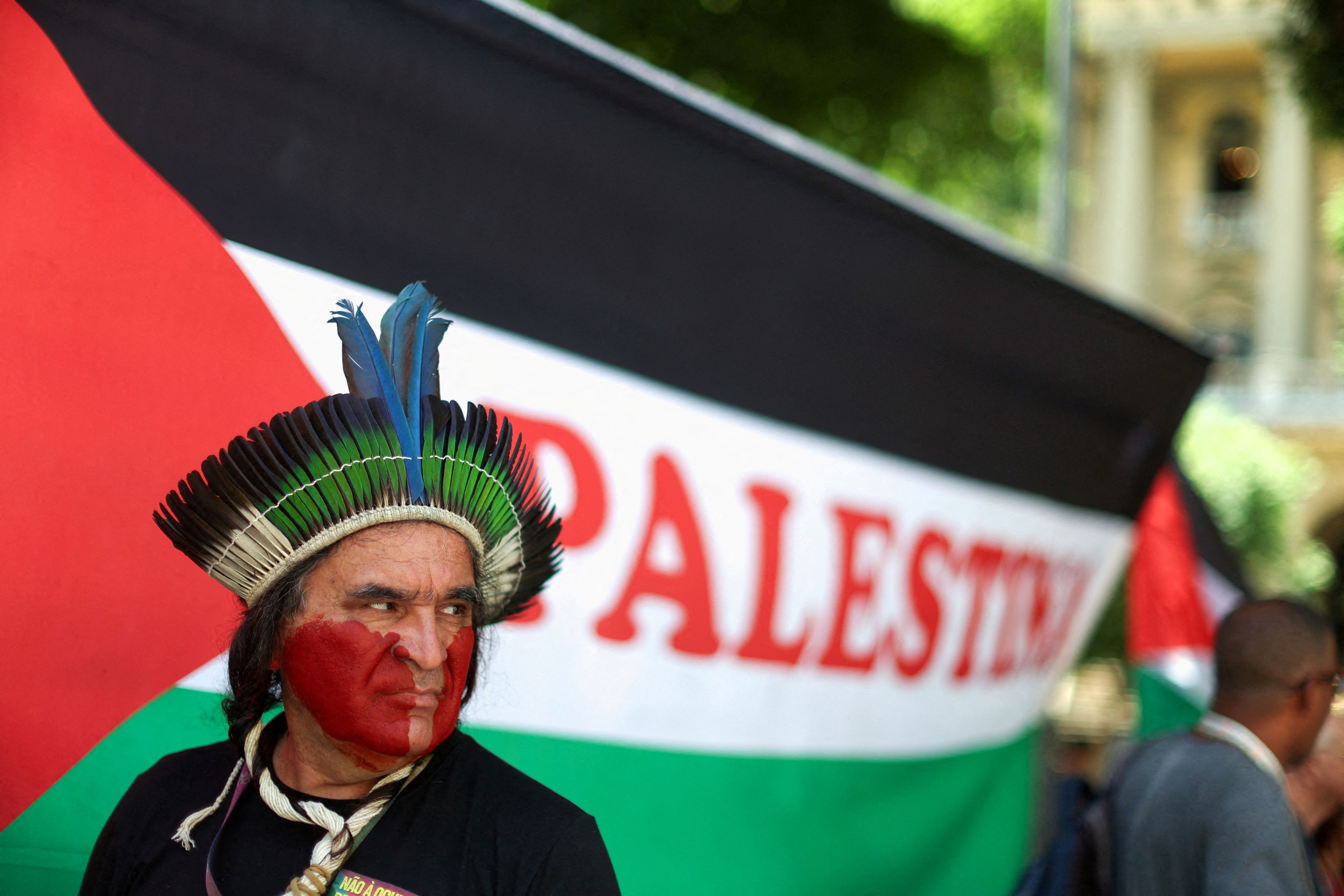 People take part in a pro-Palestinian demonstration, amid a meeting of foreign ministers as part of Brazil's presidency of the G20, in Rio de Janeiro, Brazil on February 22, 2024. (Photo by Pilar Olivares/Reuters)