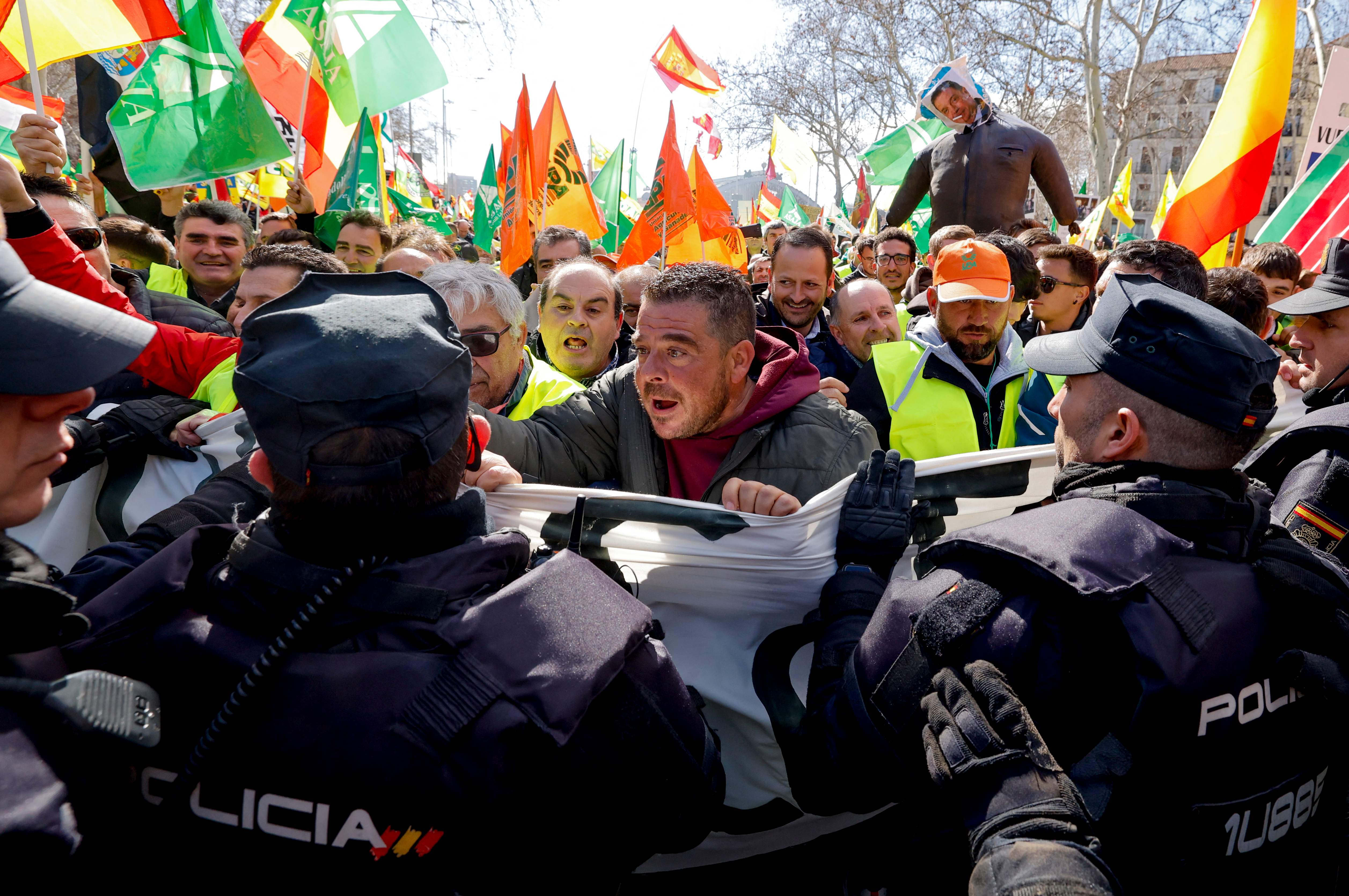 Farmers face police officers during a protest to denounce their conditions and the European agricultural policy, in Madrid, on February 26, 2024. Spanish farmers and livestock breeders demanding product prices to cover their production costs, and for non-EU imports to face the same regulations they do, resume protest as EU agriculture ministers meet in Brussels on February 26, 2024. Spanish farmers are part of a wider movement that has seen roads blocked in France, Germany, Italy, Poland and Greece, among other countries. (Photo by Oscar Del Pozo/AFP Photo)