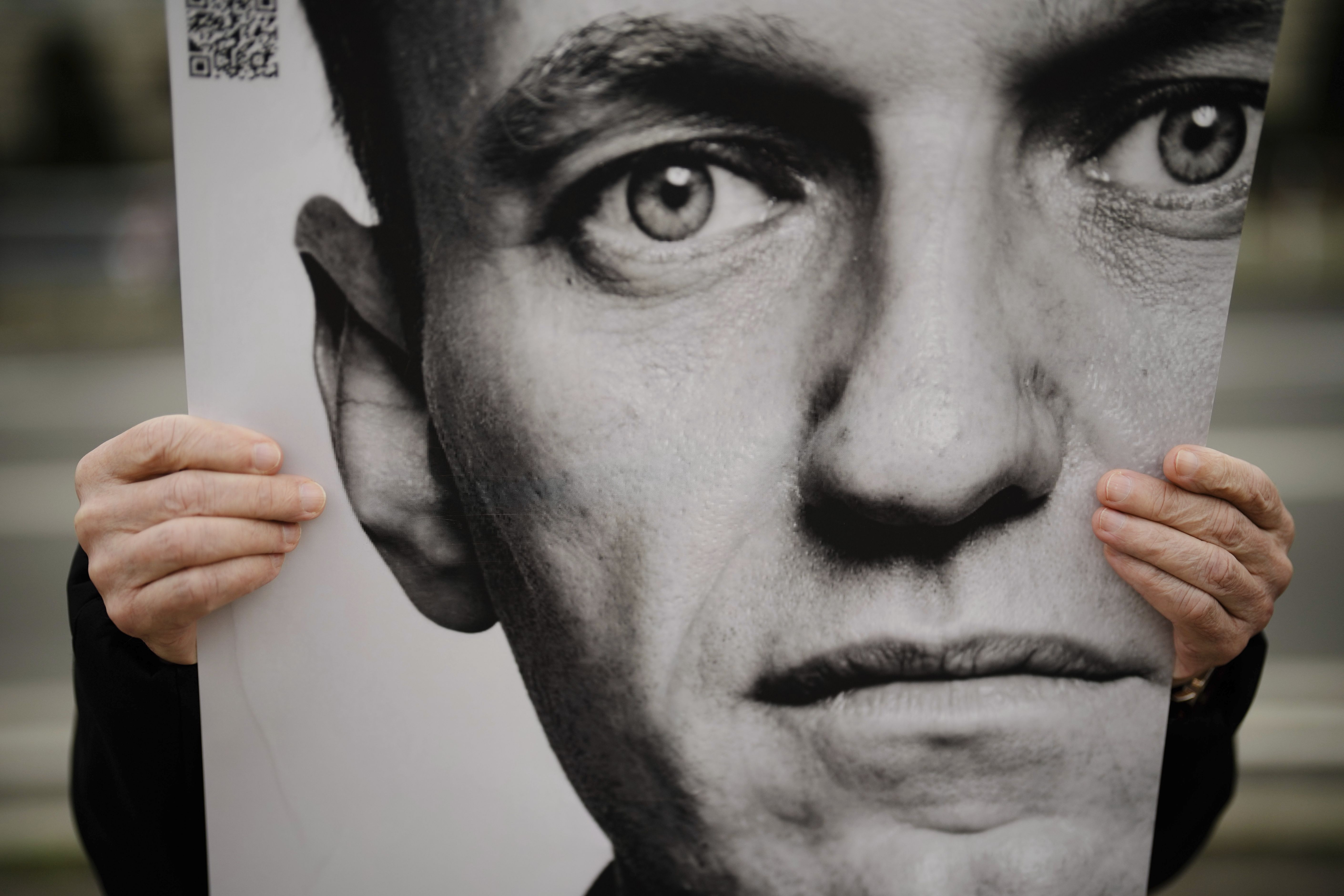 A man holds a poster with a portrait of opposition leader Alexei Navalny during a protest in front of the Russian embassy in Berlin, Germany, Friday, February 16, 2024. Navalny, who crusaded against official corruption and staged massive anti-Kremlin protests as President Vladimir Putin’s fiercest foe, died Friday in the Arctic penal colony where he was serving a 19-year sentence, Russia’s prison agency said. He was 47. (Photo by Markus Schreiber/AP Photo)