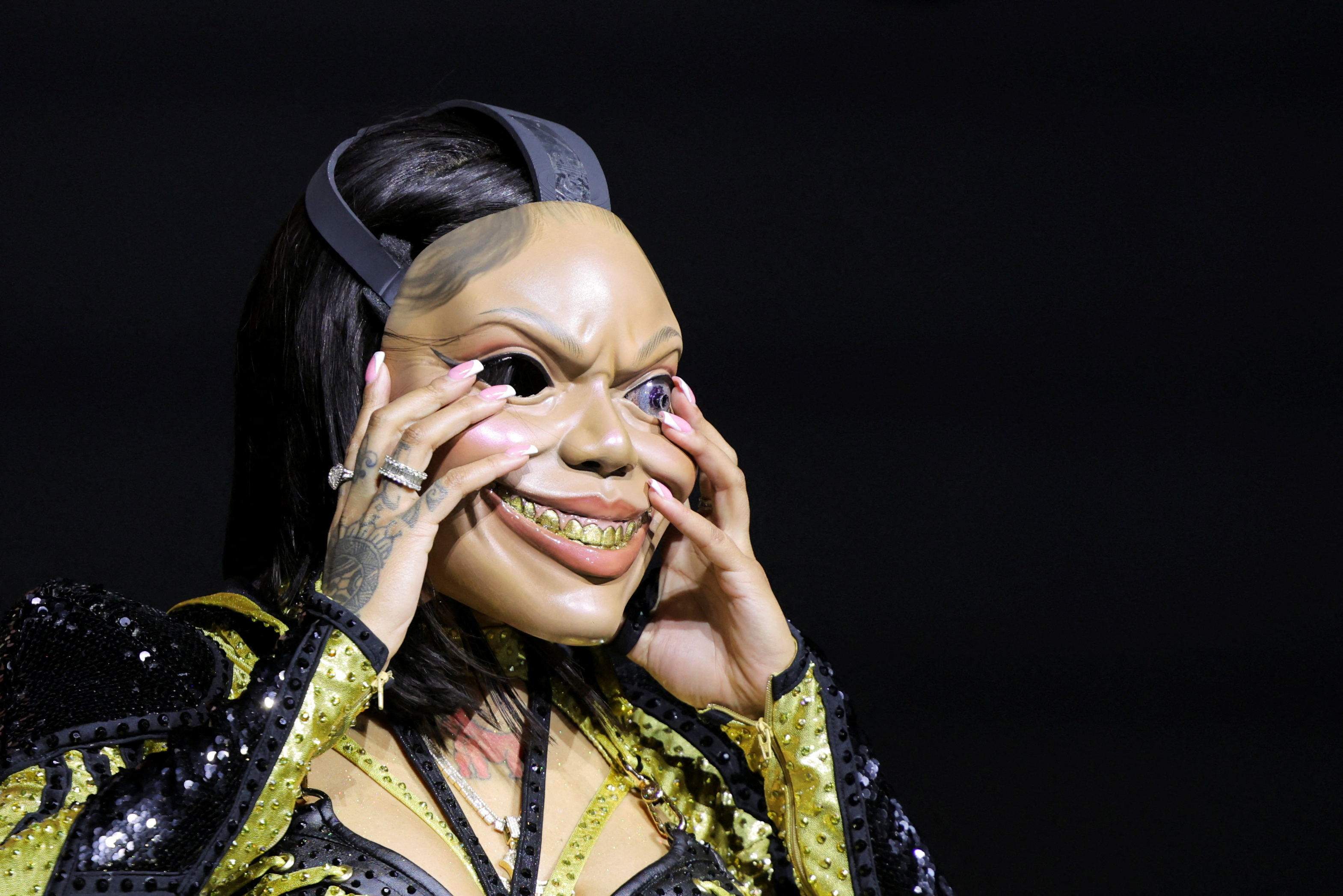 Rapper GloRilla wears a mask during her performance at the Coachella Valley Music and Arts Festival in Indio, California, U.S., April 11, 2025. (Photo by Daniel Cole/Reuters)