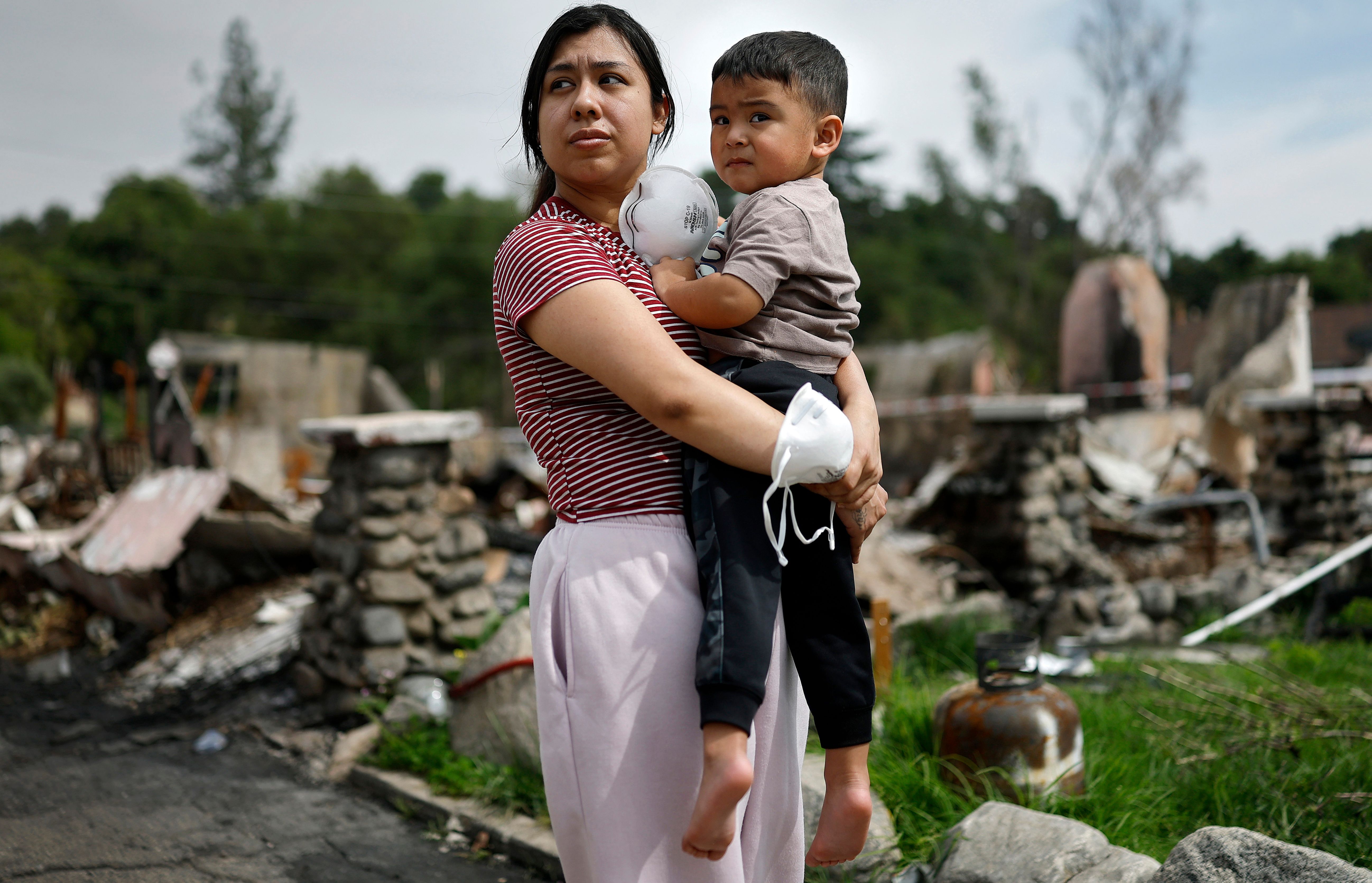 Daisy Trejo Caro holds her nephew Liam, 2, as they gather outside their destroyed home with other family members to view the start of debris removal by Army Corps of Engineers contractors, on April 14, 2025 in Altadena, California. Seven members of the Trejo family lived in the home, which was destroyed in the Eaton Fire, and they are hoping to rebuild. Family members tried to save the home with a water hose before a rush of embers, smoke and fire became overwhelming. Daisy said her family had lived in the home for nearly 25 years. (Photo by Mario Tama/Getty Images)