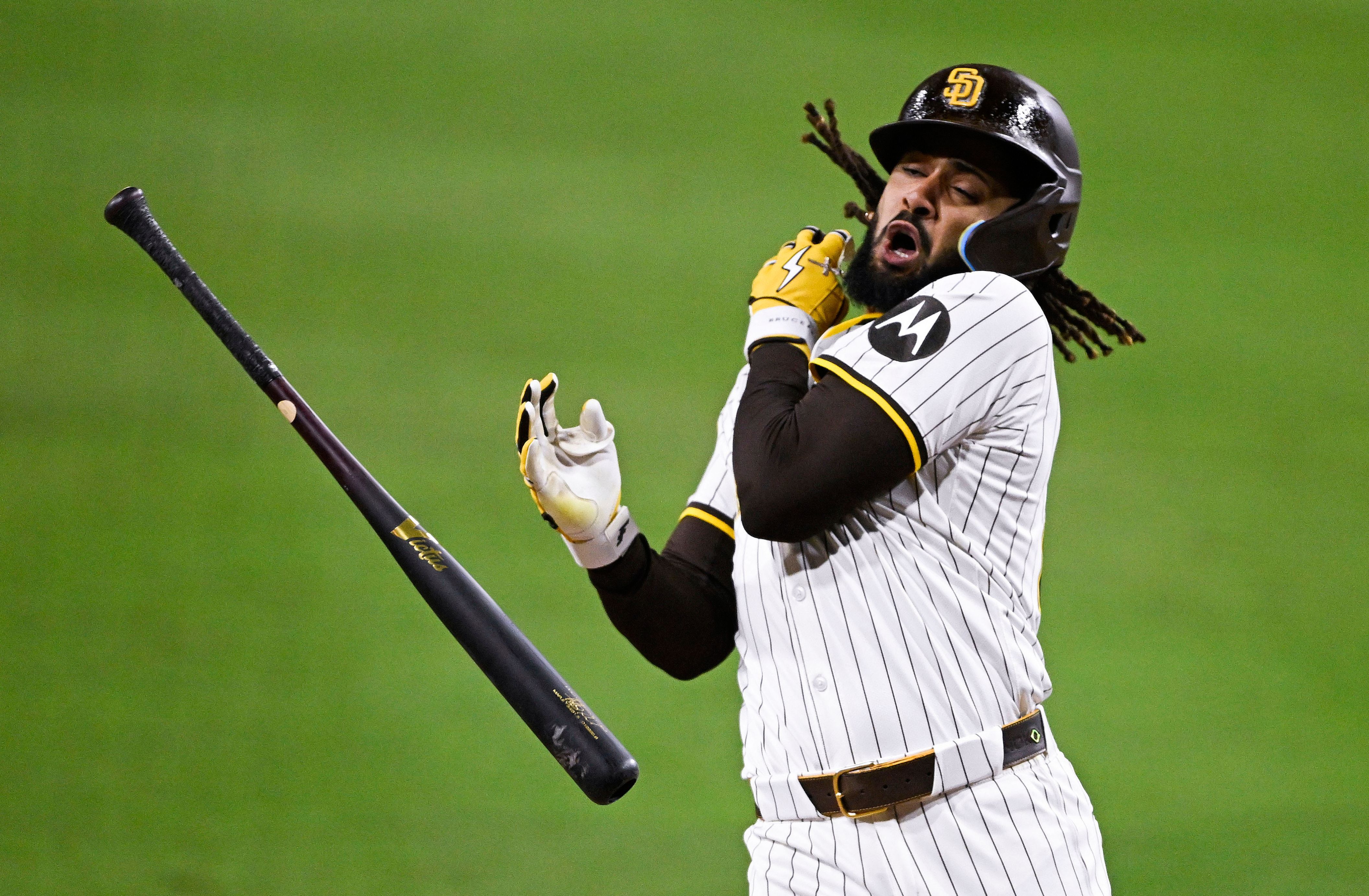 San Diego Padres' Fernando Tatis Jr. (23) is hit with a pitch during the seventh inning of a baseball game against the Chicago Cubs, Monday, April 14, 2025, in San Diego, Calif. (Photo by Denis Poroy/AP Photo)