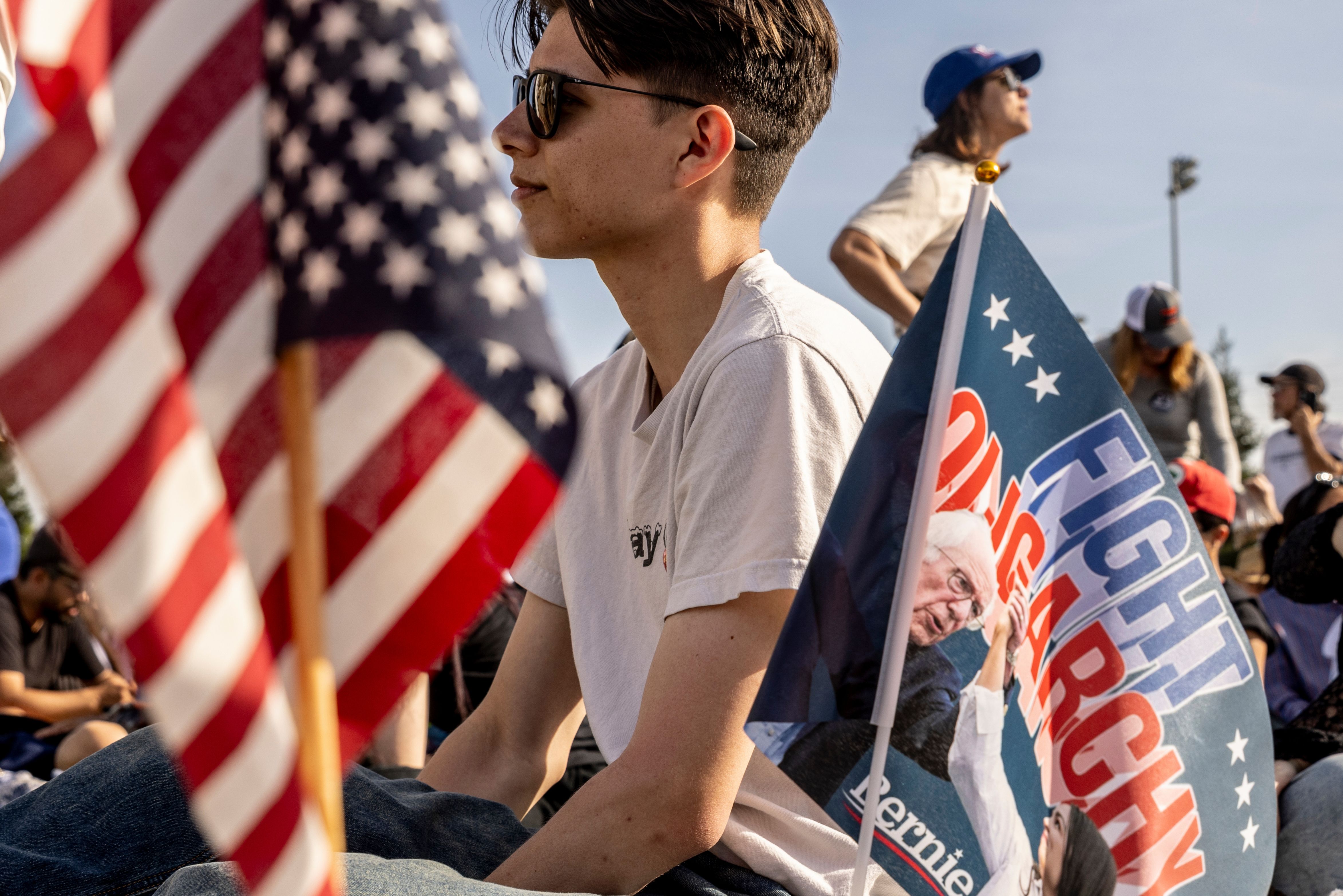 Ethan Jackline, sits next to a flag planted by a friend as they attend a “Fighting Oligarchy” rally with Sen. Bernie Sanders (I-VT) and Rep. Alexandria Ocasio-Cortez (D-NY) in Folsom, Calif., Tuesday, April 15, 2025. (Photo by Stephen Lam/San Francisco Chronicle via Getty Images)