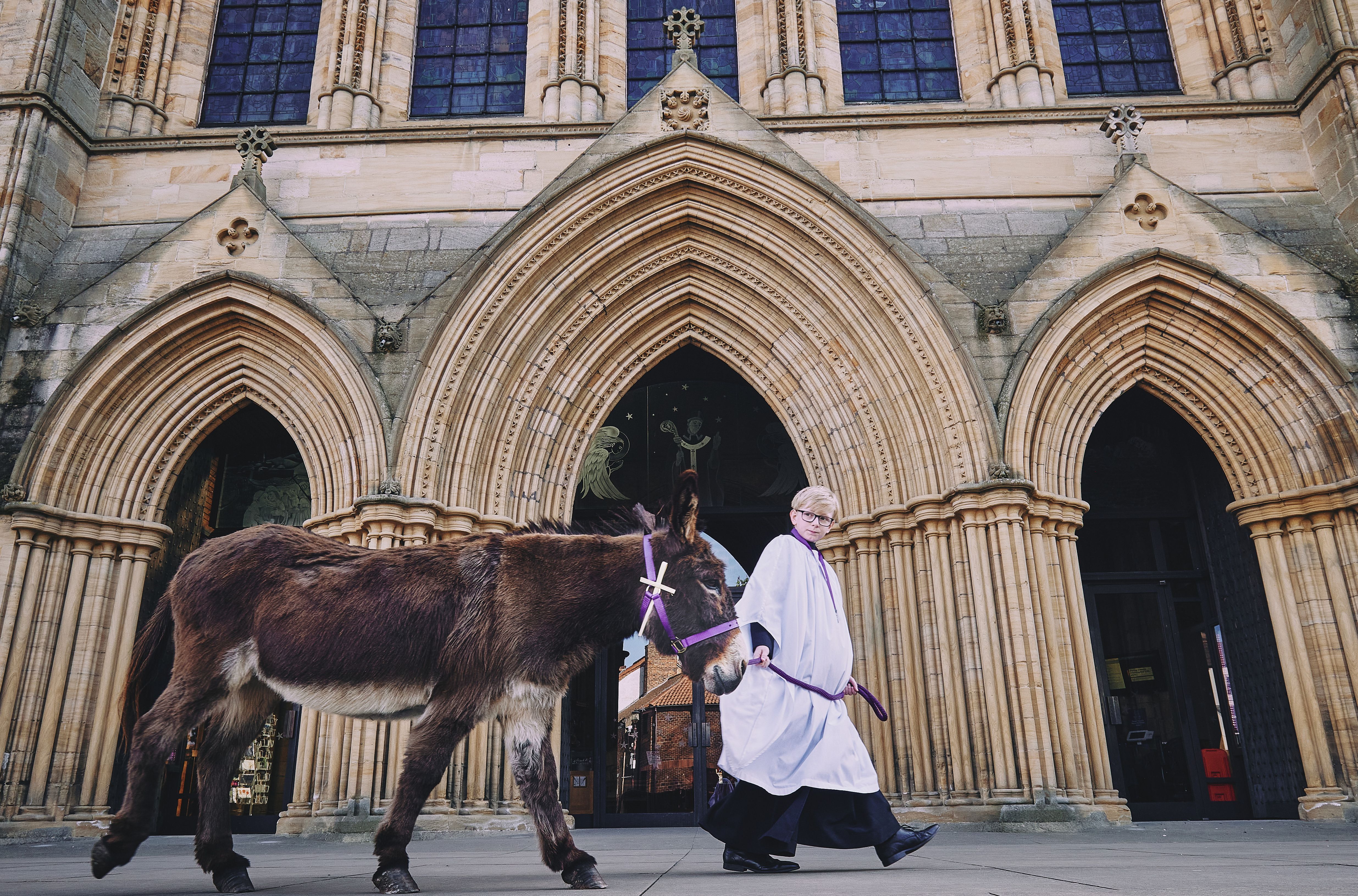 Xander Galloway-Gee, a member of the choir at Ripon Cathedral in North Yorkshire, UK leads Lily the Donkey to church for Eucharist as part of a Palm Sunday procession on April 13, 2025. (Phoot by James Glossop/Times Media Ltd)