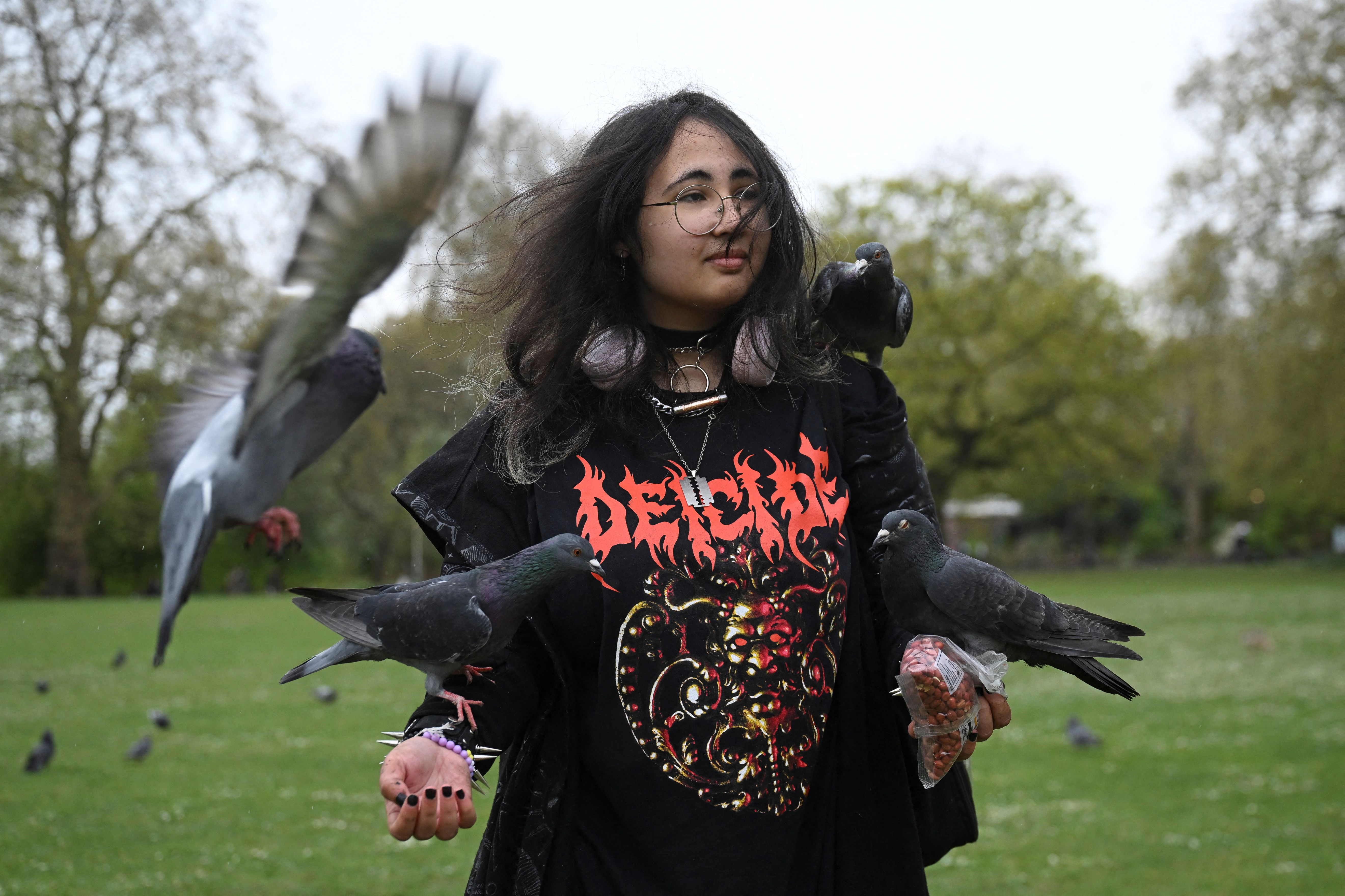 A woman poses with pigeons at St. James's Park in London, Britain, on April 13, 2025. (Photo by Jaimi Joy/Reuters)
