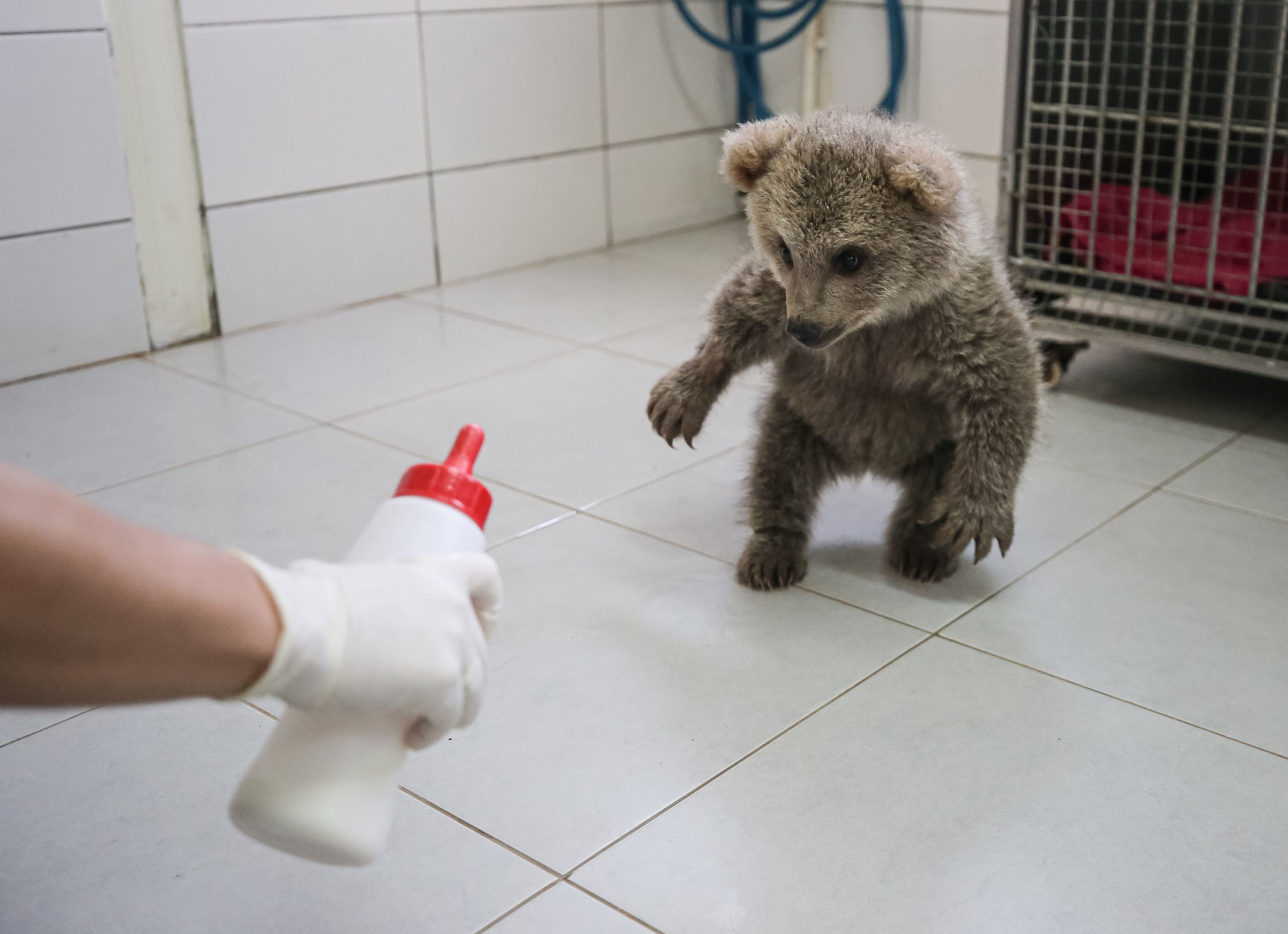 Two bear cubs, found by citizens in Karabuk and Bingol districts of Yenice, are being carefully cared for at the Celal Acar Wildlife Rescue and Rehabilitation Center in Bursa, Turkiye on April 17, 2025. (Photo by Fatih Capkin/Anadolu via Getty Images)
