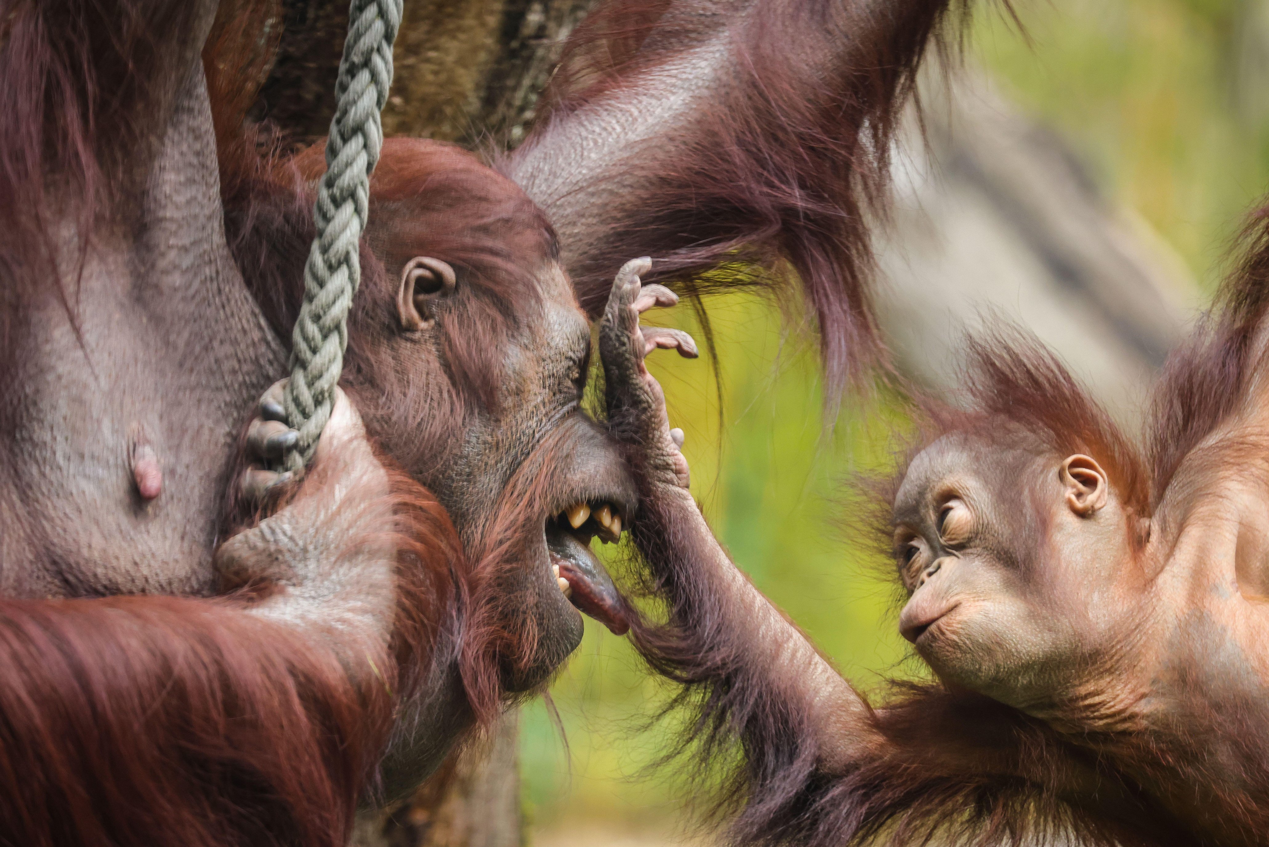 Bornean orangutan baby (Pongo pygmaeus), now almost 2 years old, has fun enjoying the sunshine and warm temperatures in the large outdoor enclosure with his mum Mandi in Munster, Germany on April 14, 2025. Mothers and offspring of the critically endangered species will typically spend their first few years together and display typically close attachment to each other. (Phoot by Alamy Live News)