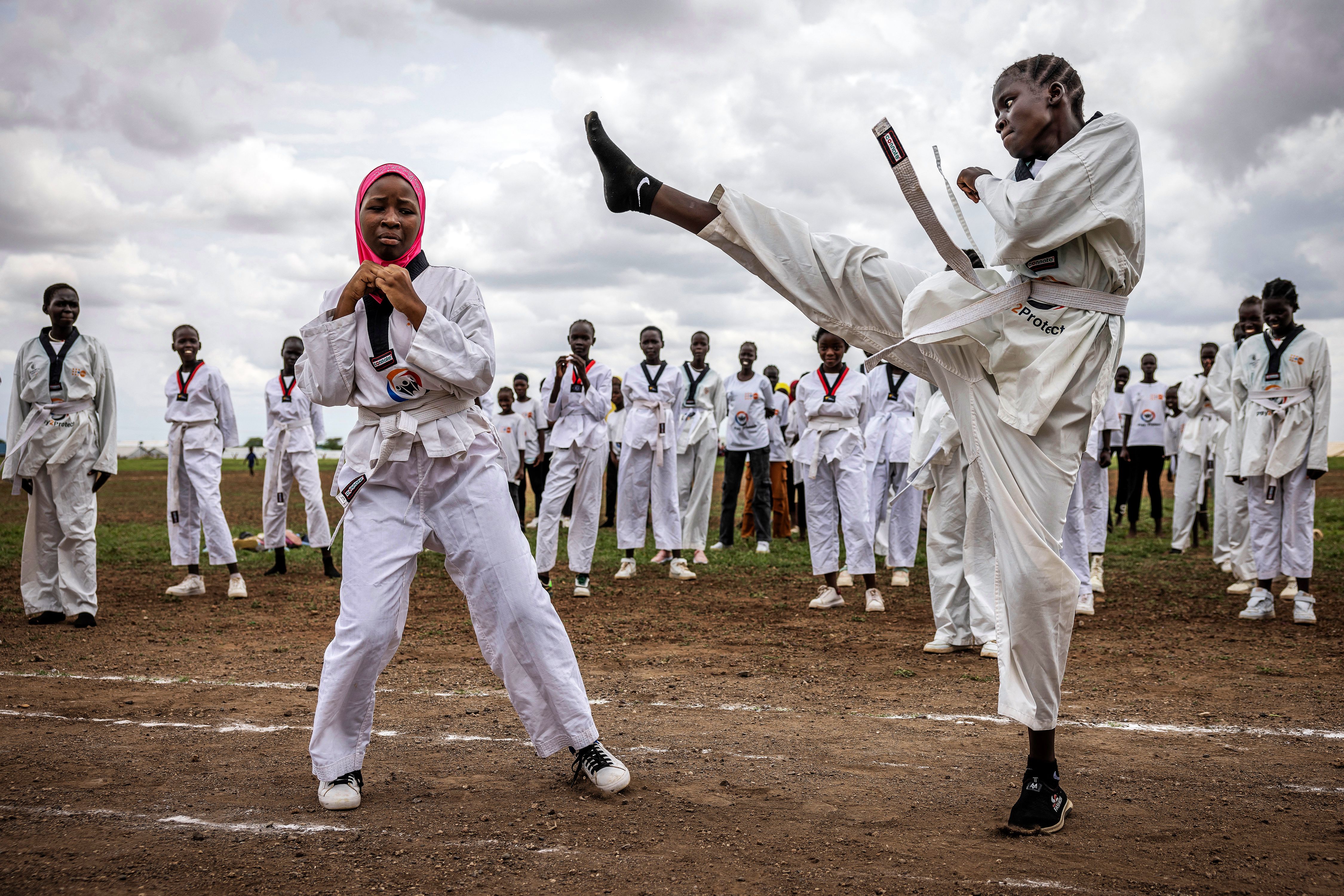 Ajok Chol, 18, a South Sudanese refugee (L), performs a taekwondo kick during a sparring demonstration with another refugee girl as part of a showcase performance at a sports day event at the Kalobeyei Sports Complex in Kalobeyei, Kenya on March 28, 2025. (Photo by Luis Tato/AFP Photo)