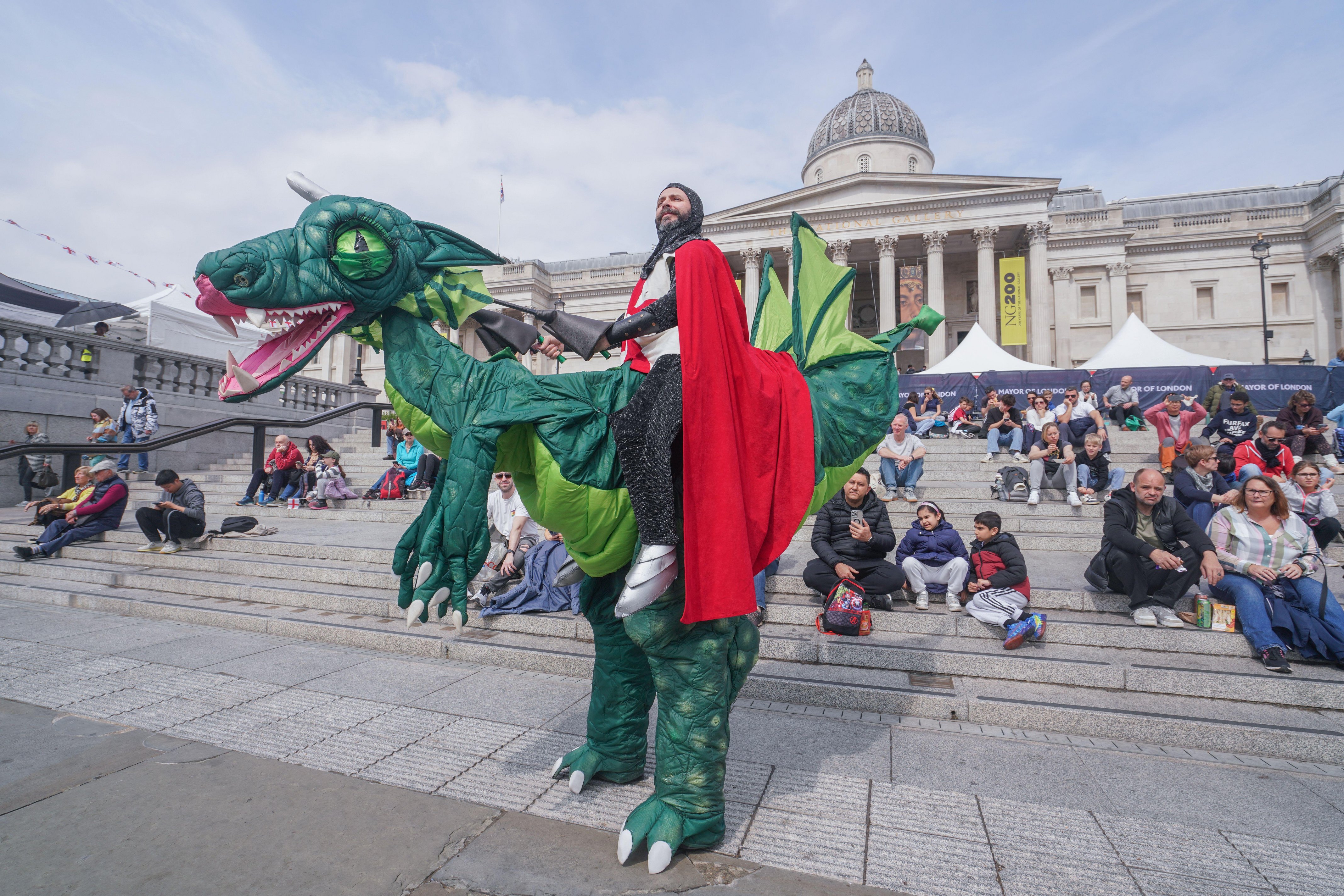 Saint George rides a dragon in Trafalgar Square in London on April 23, 2025. People enjoy the festivities on St George's Day in Trafalgar Square to celebrate English culture with appearances by St George and his Dragon, Pearly Kings and Queens, and carnival performers. (Photo by Amer Ghazzal/Alamy Live News)