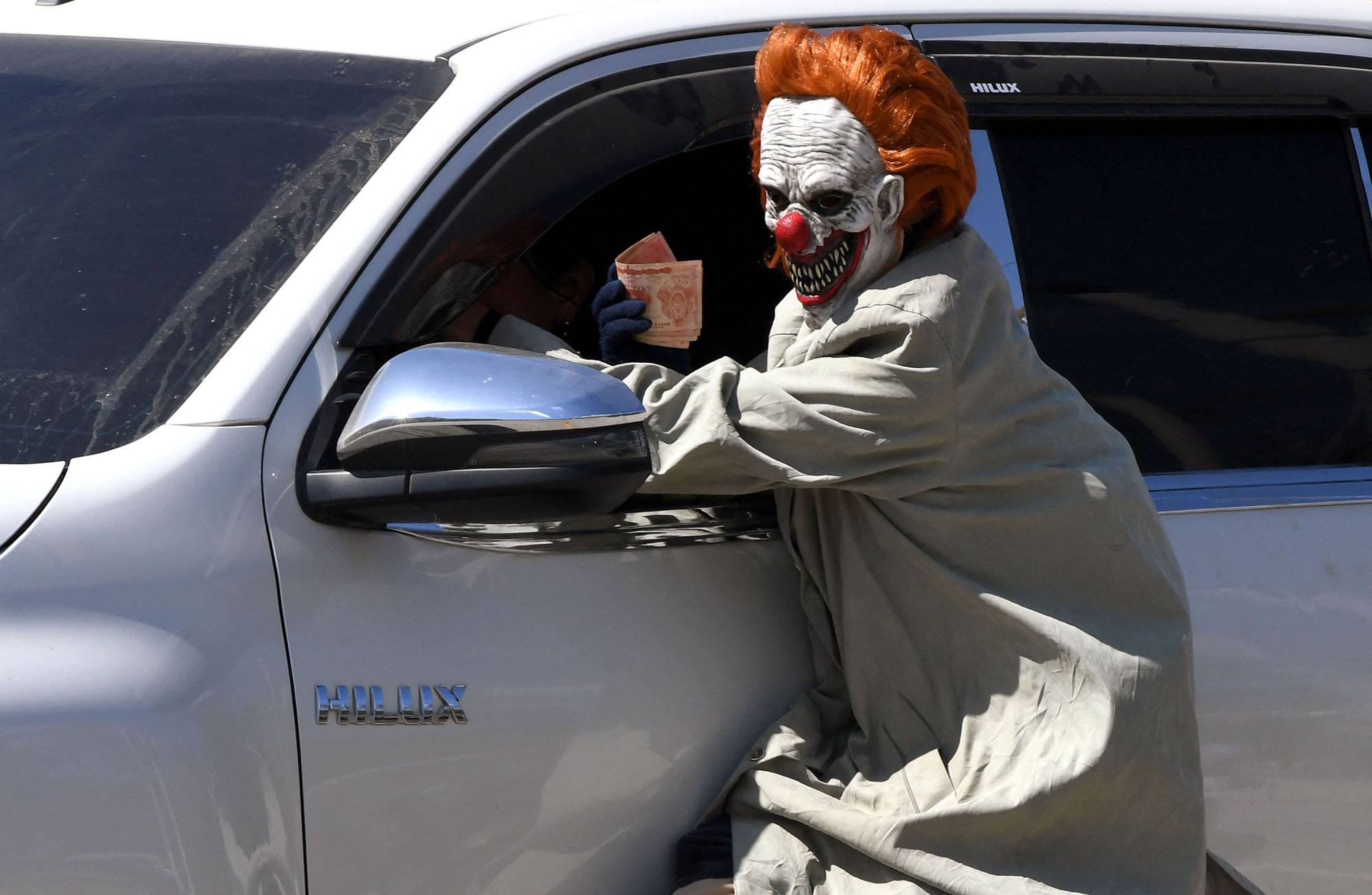 A reveler wears a mask to ask for money on a road as part of the holy week celebrations in Quimistan, Honduras on April 14, 2025. (Photo by Orlando Sierra/AFP Photo)