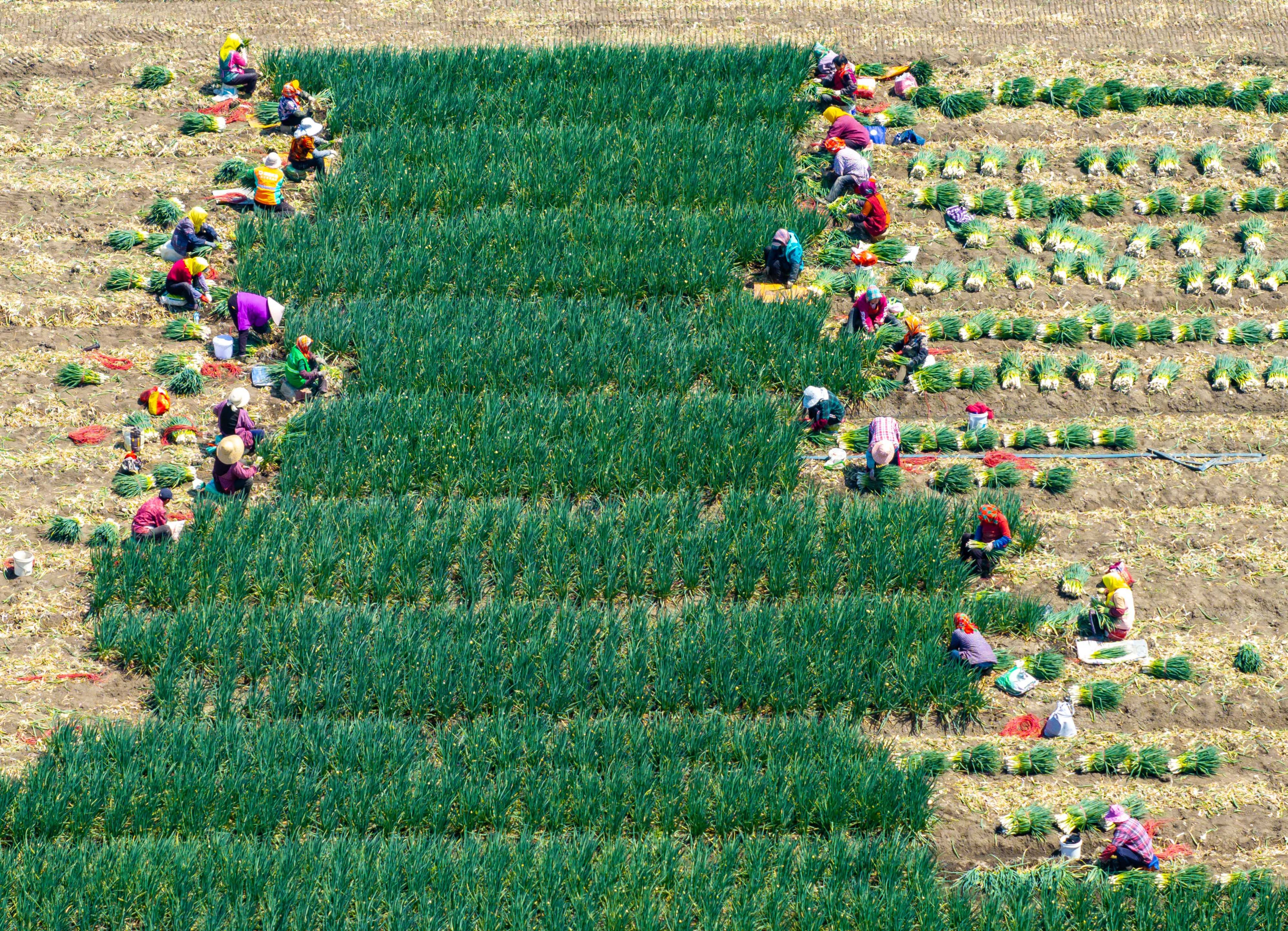 Farmers harvest chives at a chives planting base on a family farm in Yangzhou, China, on April 6, 2025. (Photo by Costfoto/NurPhoto/Rex Features/Shutterstock)