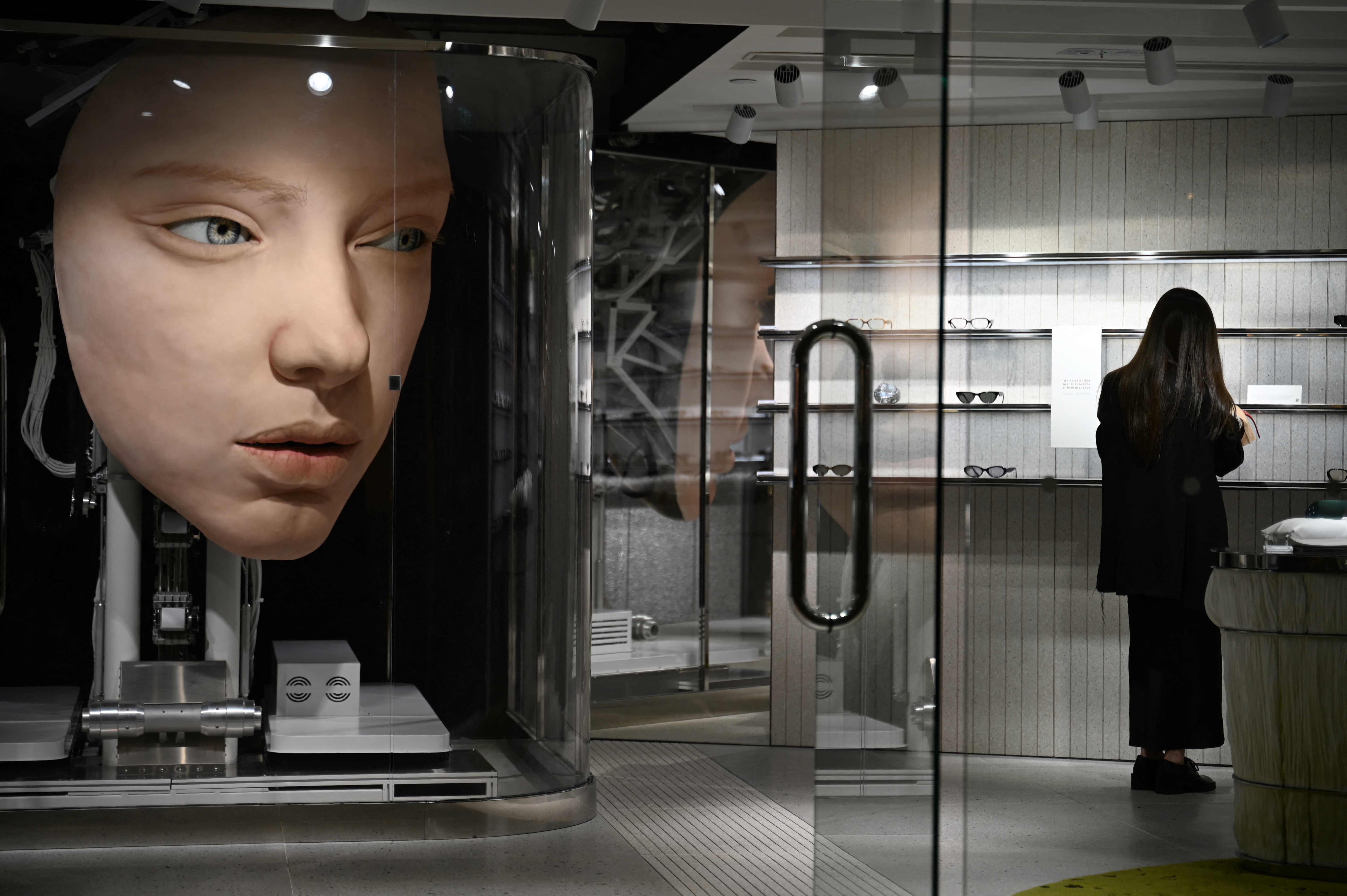 A mechanical face “looks” at people in a boutique store in Hong Kong on April 16, 2025. (Photo by Peter Parks/AFP Photo)