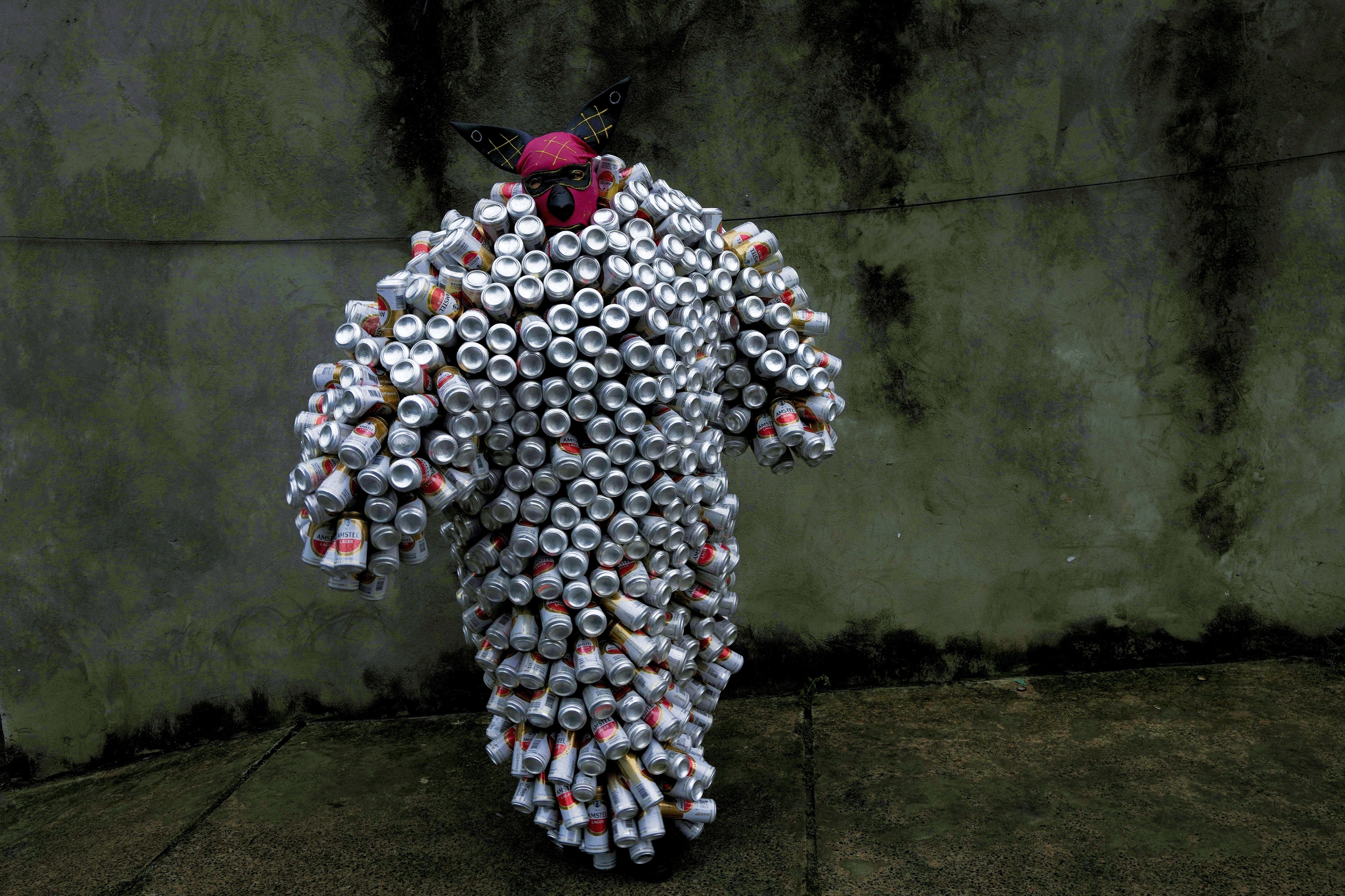 A reveler wearing a costume made from beer and soda cans takes part in the “Bloco da Latinha” street party Carnival parade in Madre de Deus, Brazil, Sunday, February 11, 2024. (Photo by Eraldo Peres/AP Photo)