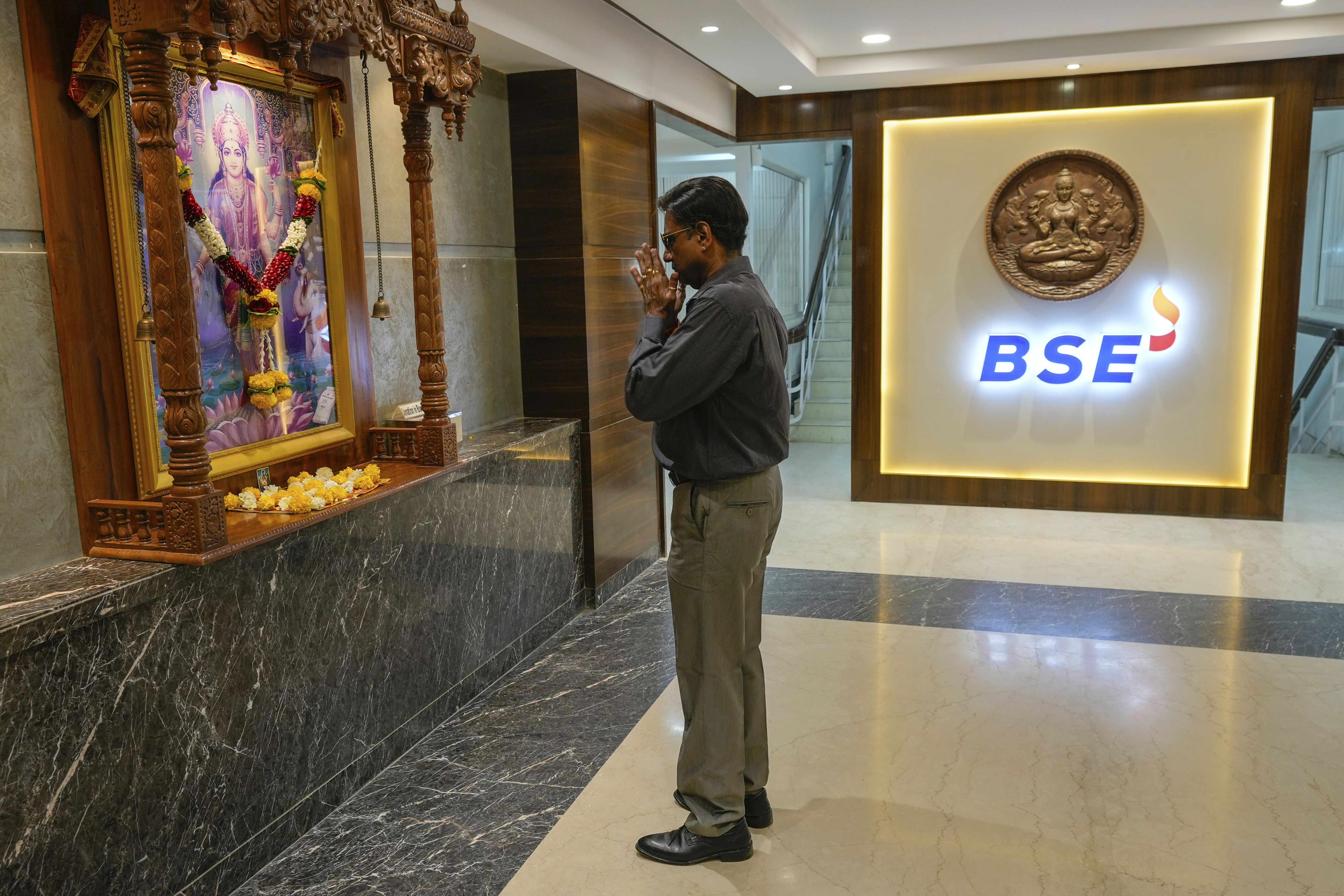 A person working in the Bombay Stock Exchange building prays to Hindu Goddess Laxmi, the embodiment of wealth, fortune, prosperity, before starting his work in Mumbai, India, Tuesday, April 8, 2025. (Photo by Rafiq Maqbool/AP Photo)