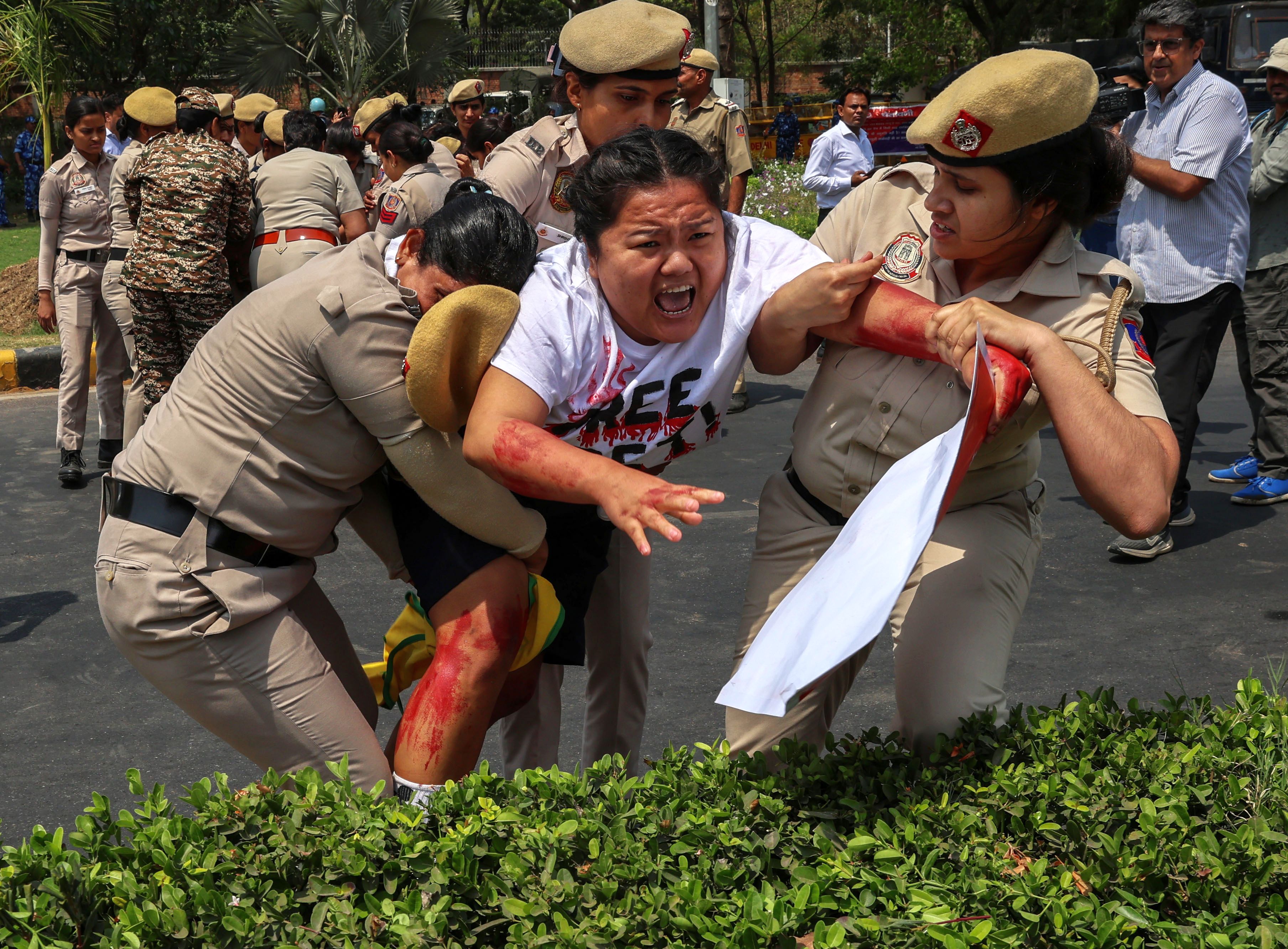Indian security personnel detain a Tibetan Youth Congress (TYC) activist outside the Chinese Embassy in New Delhi, India, 11 April 2025. TYC members were protesting the alleged sudden and mysterious death of Tulku Hungkar Dorje, a revered Tibetan religious leader, while in custody in Vietnam. The activists called for a transparent and independent investigation into the circumstances of his death and the public release of its findings. (Photo by Rajat Gupta/EPA/EFE)