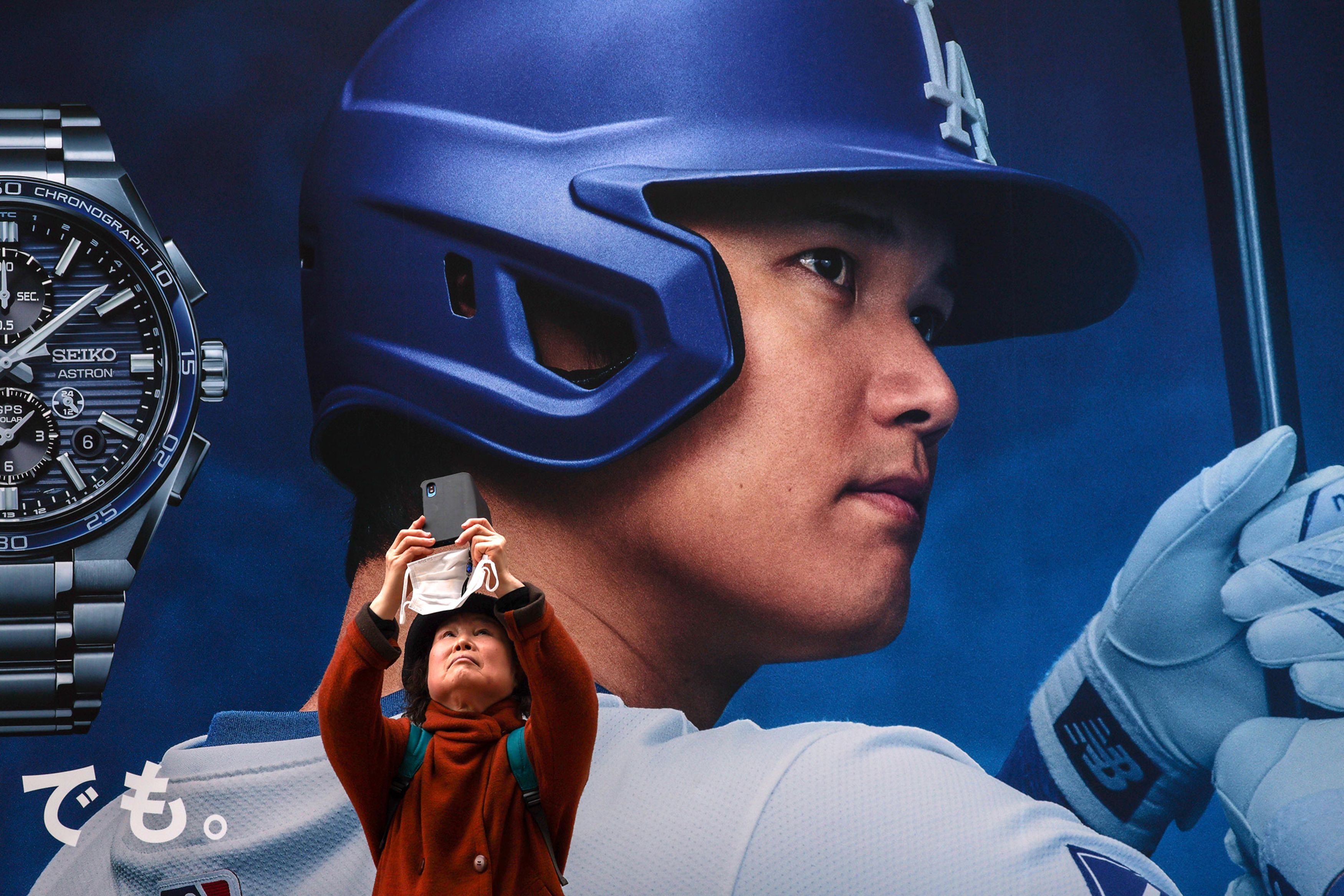 A person in Tokyo takes a photo of an advertisement featuring Japanese baseball star Shohei Ohtani on Monday, March 17, 2025. Ohtani and the Los Angeles Dodgers opened Major League Baseball’s regular season in Tokyo, defeating the Chicago Cubs. (Photo by Robert Gauthier/Los Angeles Times/Getty Images)