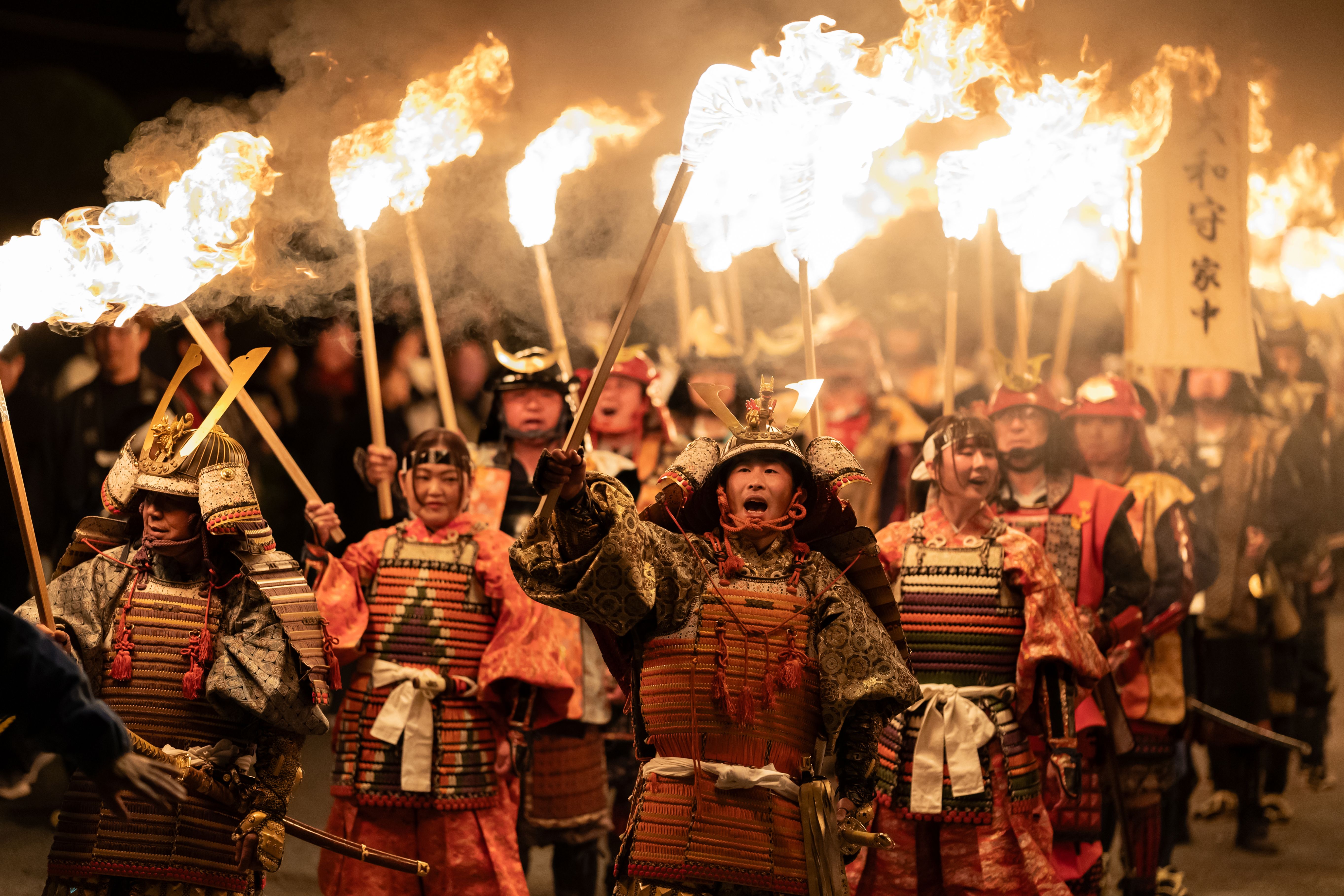 People dressed in samurai warrior costumes hold flaming torches as they march during the Kanoukaen Fire Festival at night on March 29, 2025 in Unzen, Nagasaki Prefecture, Japan. The fire festival which is based on a story depicted in a historical scroll over 400 years old was held in the cherry blossom season in the country. (Photo by Tomohiro Ohsumi/Getty Images)