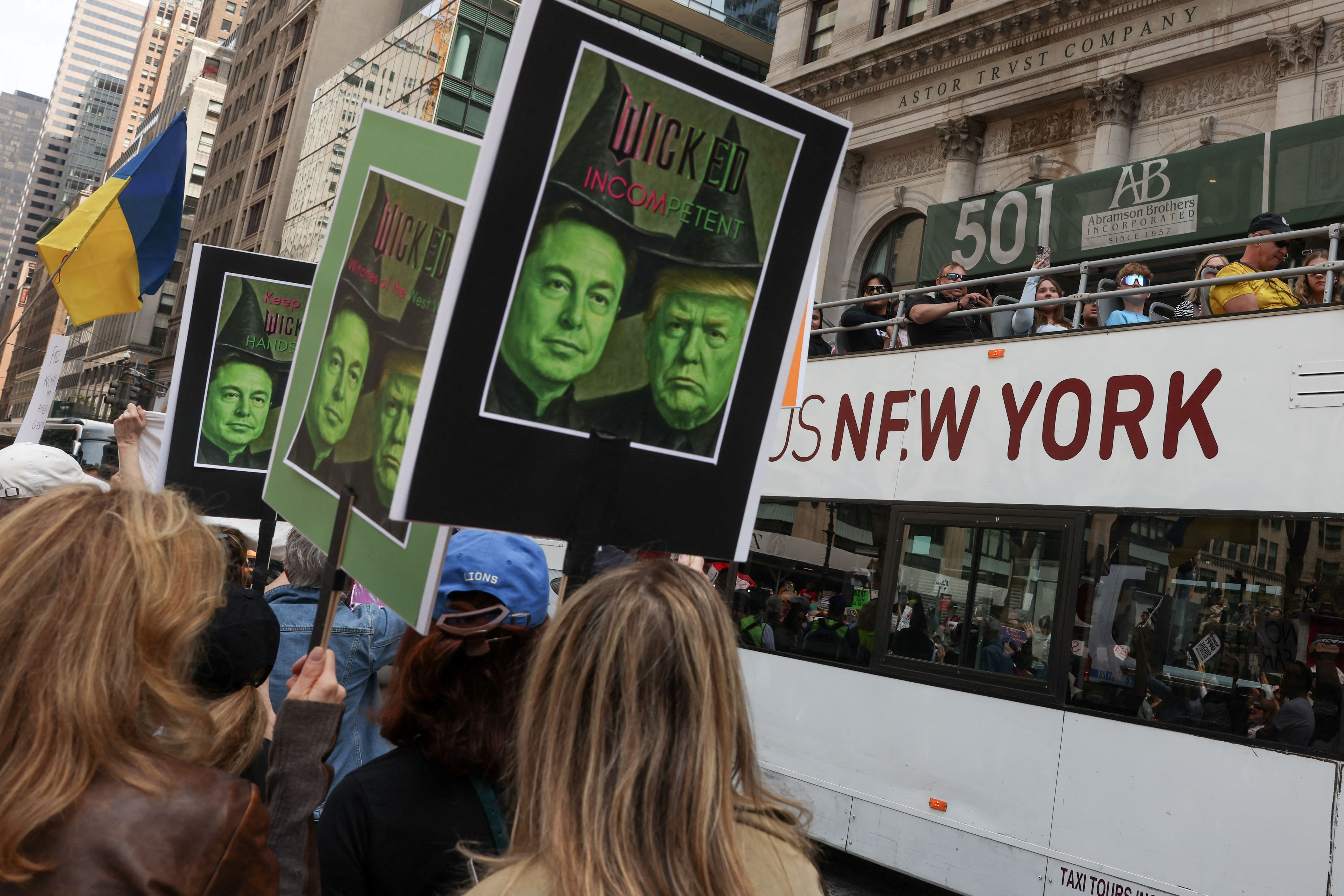 Tourists pass in a bus as people rally to “Protect Migrants, Protect the Planet” in New York City, U.S., April 19, 2025. (Photo by Caitlin Ochs/Reuters)