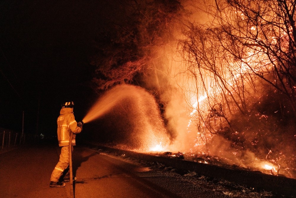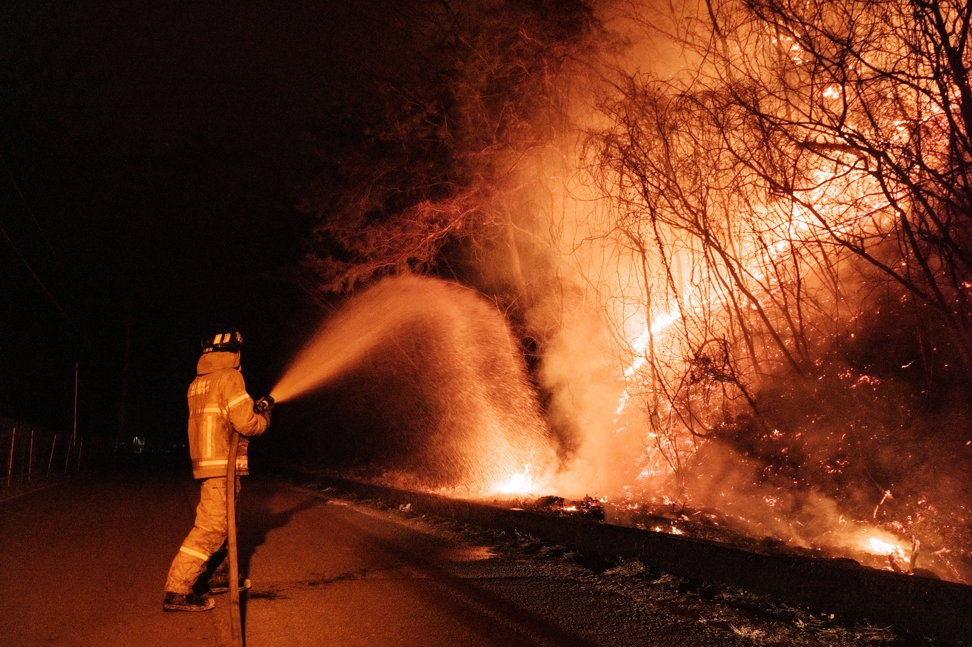 A firefighter sprays water as wildfires spread along the slopes in Uiseong, South Korea, on March 24, 2025. South Korean authorities said on March 24 they would deploy dozens of helicopters and thousands of firefighters and soldiers as they struggle to control multiple wildfires in the southeast, which have been burning for days. (Photo by Yasuyoshi Chiba/AFP Photo)
