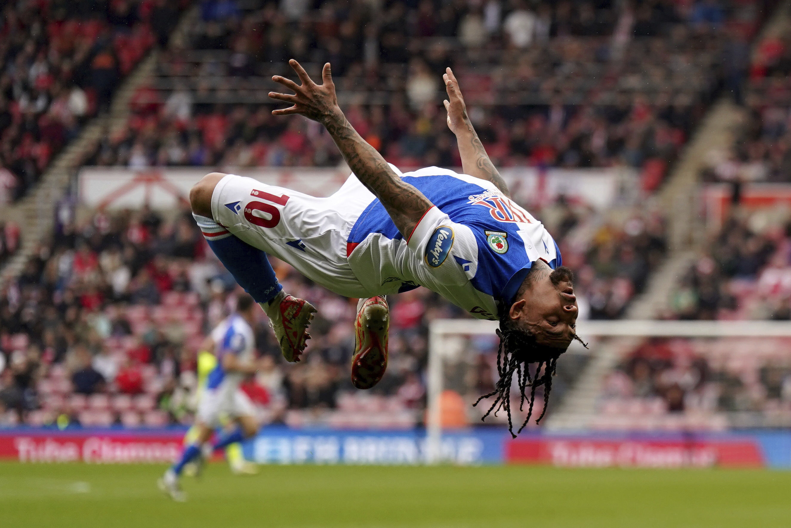 Blackburn Rovers' Tyrhys Dolan celebrates scoring his side's first goal during the Sky Bet Championship match between Sunderland and Blackburn Rovers, at the Stadium of Light, Sunderland, England, Monday April 21, 2025. (Photo by Owen Humphreys/PA Wire via AP Photo)
