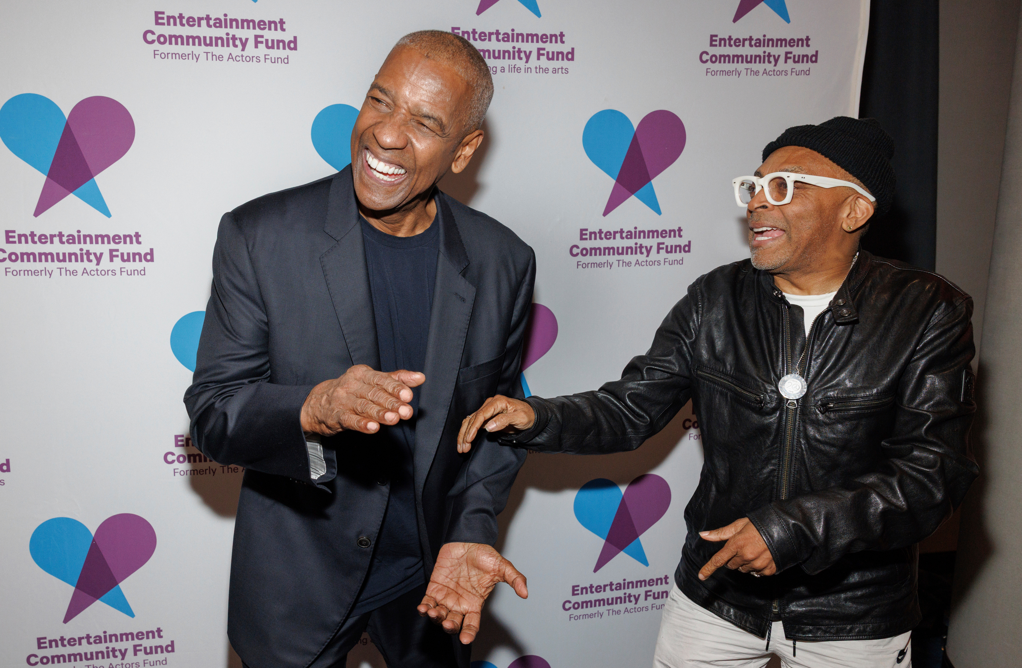 Denzel Washington (left) and Spike Lee attend the Entertainment Community Fund Gala at the Marriott Marquis in New York, US on April 21, 2025. (Photo by CJ Rivera/Invision/AP Photo)