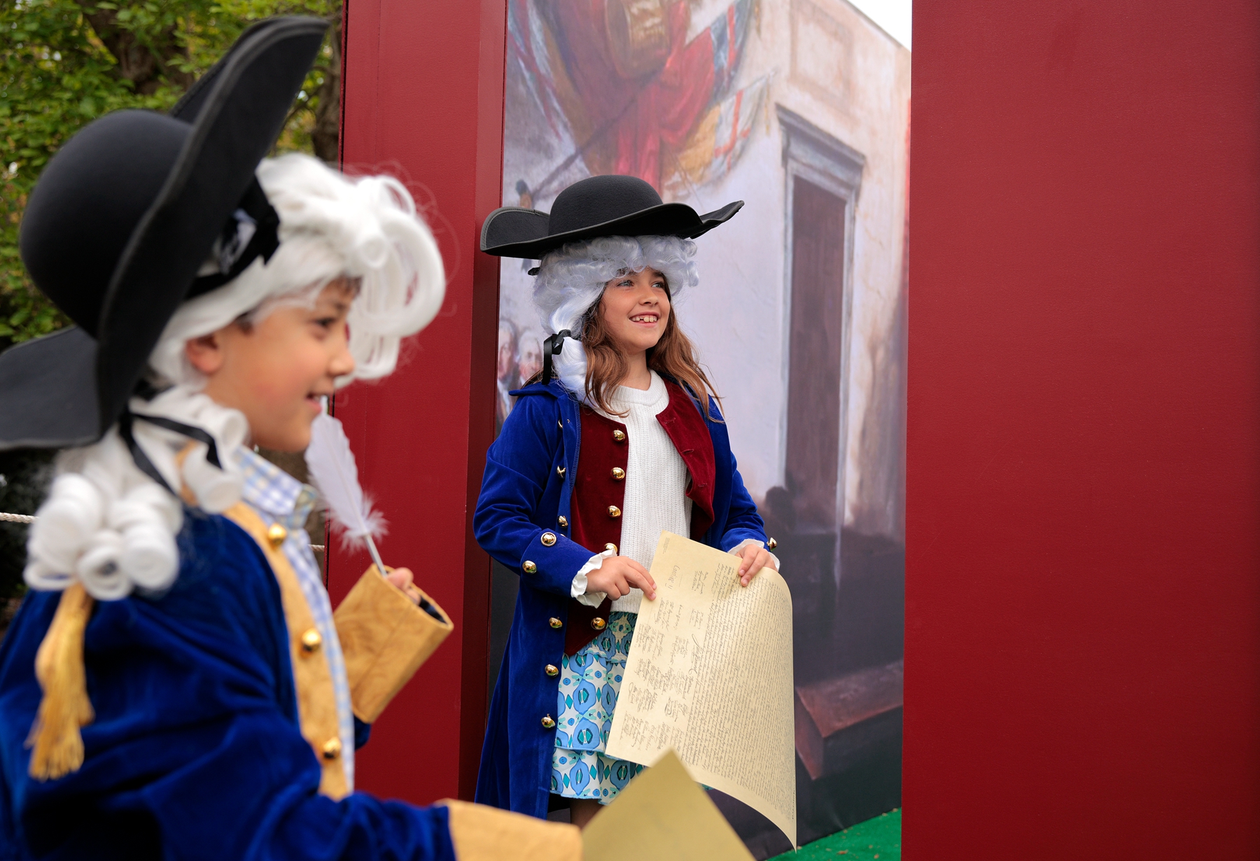 Children dress-up as the "Founding Fathers" during the White House Egg Roll on the South Lawn on April 21, 2025 in Washington, DC. The White House is expecting thousands of children and adults to participate in the annual tradition of rolling colored eggs down the White House lawn, a tradition started by President Rutherford B. Hayes in 1878. (Photo by Chip Somodevilla/Getty Images)