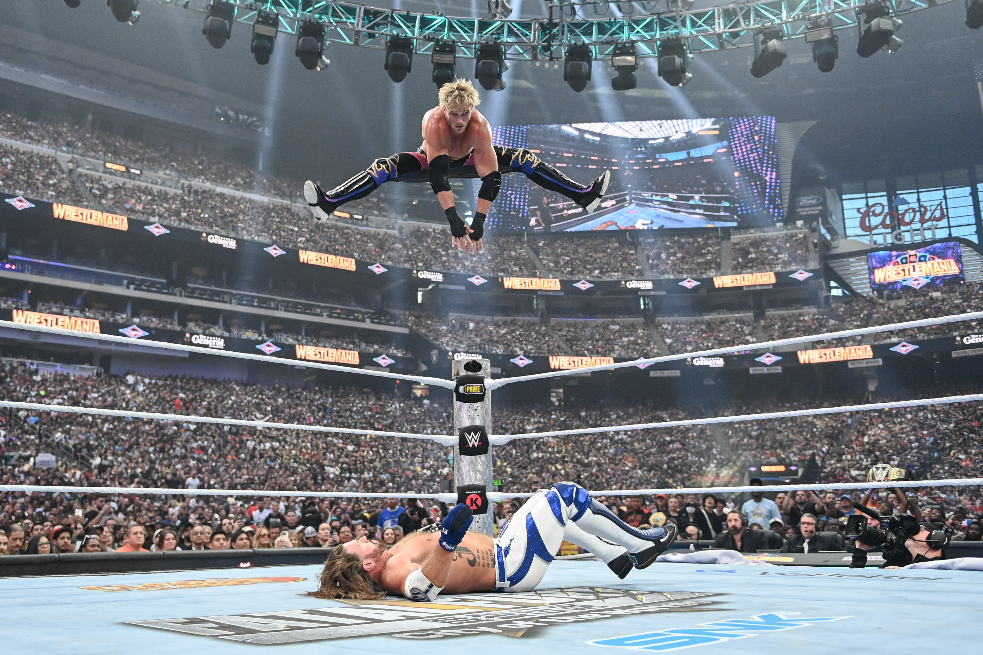 Logan Paul in action against AJ Styles during WrestleMania 41 Sunday at Allegiant Stadium on April 20, 2025 in Las Vegas, Nevada. (Photo by Andrew Timms/WWE via Getty Images)