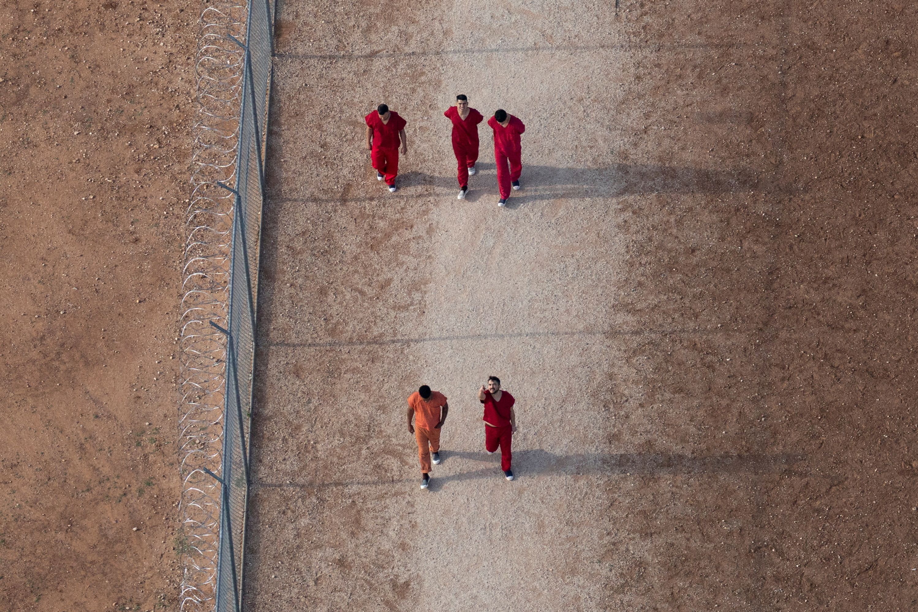 An aerial view shows Diover Jose Millan Leon of Venezuela, top left, and other detainees at the Bluebonnet Detention Facility in Anson, Texas, on April 23, 2025. Lawyers for Venezuelan migrants are trying to persuade judges across the country to require the government to give migrants 30 days' notice before deporting them under the 1798 Alien Enemies Act. (Photo by Daniel Cole/Reuters)