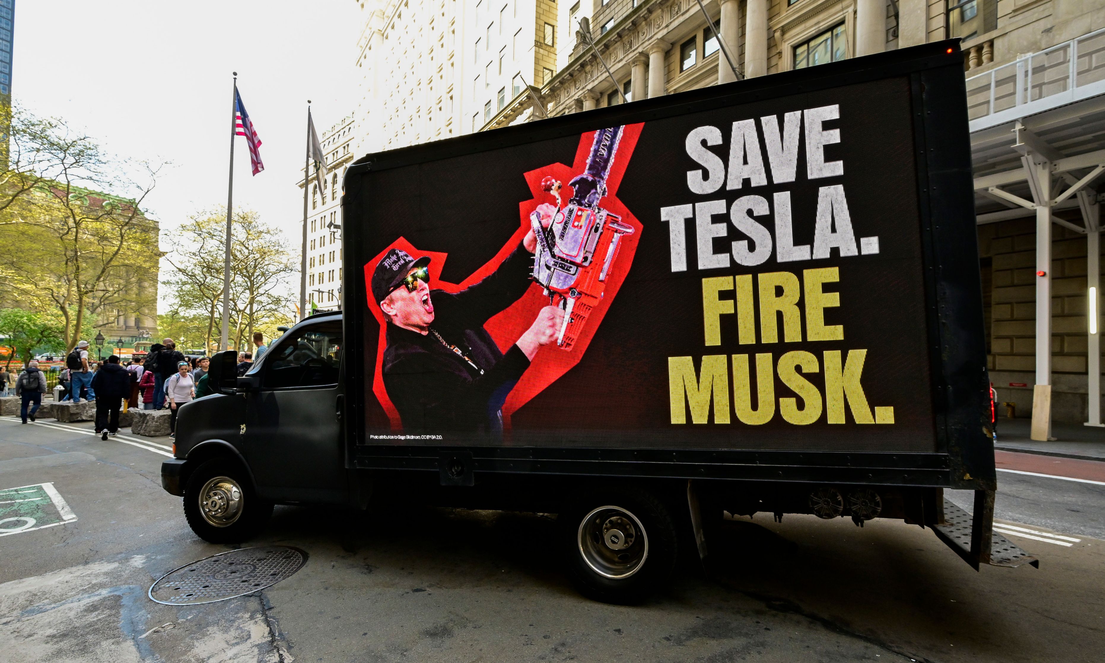 A truck with signage reading “Save Tesla. Fire Musk” drives around Manhattan on April 22, 2025 in New York City. (Photo by Eugene Gologursky/Getty Images for Save Tesla Fire Musk Campaign)