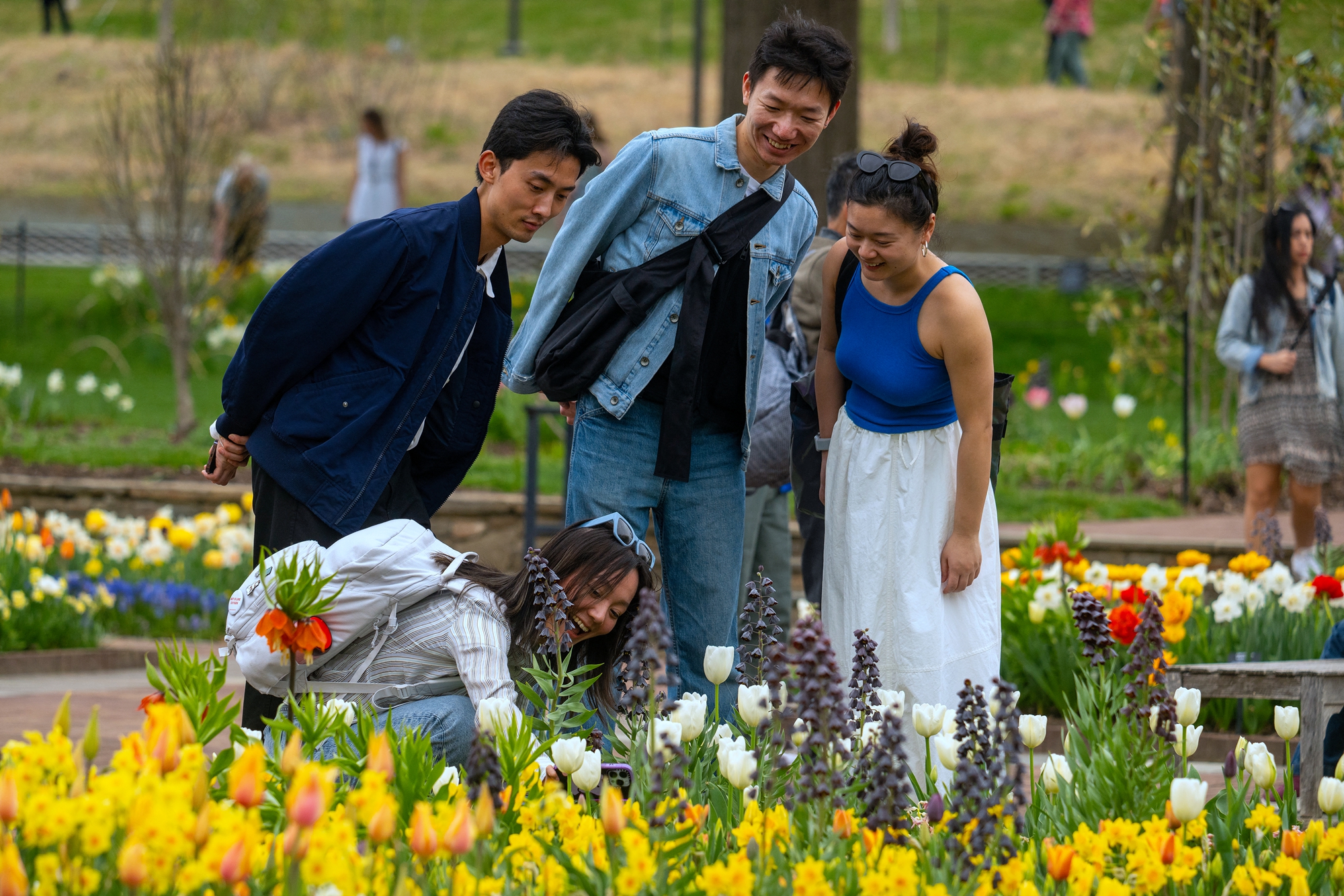 People enjoy the tulips and other flowers at Longwood Gardens in Kennett Square, Pennsylvania, on April 19, 2025, during the Easter holiday Spring Blossoms event. (Photo by Jim Watson/AFP Photo)