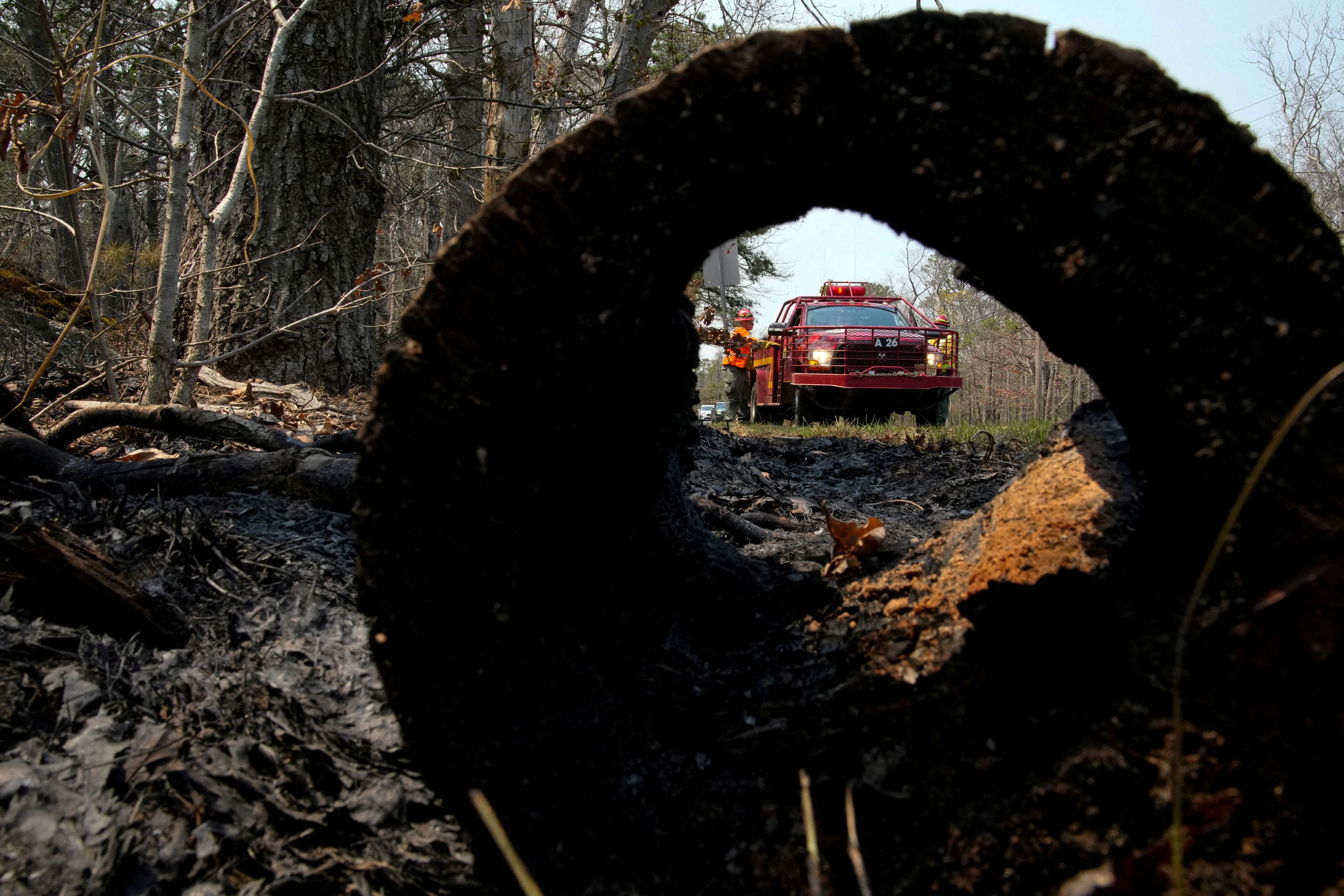 A firefighter works during a wildfire outbreak, in Forked River, in the Ocean County region of New Jersey on April 23, 2025. (Photo by Eduardo Munoz/Reuters)
