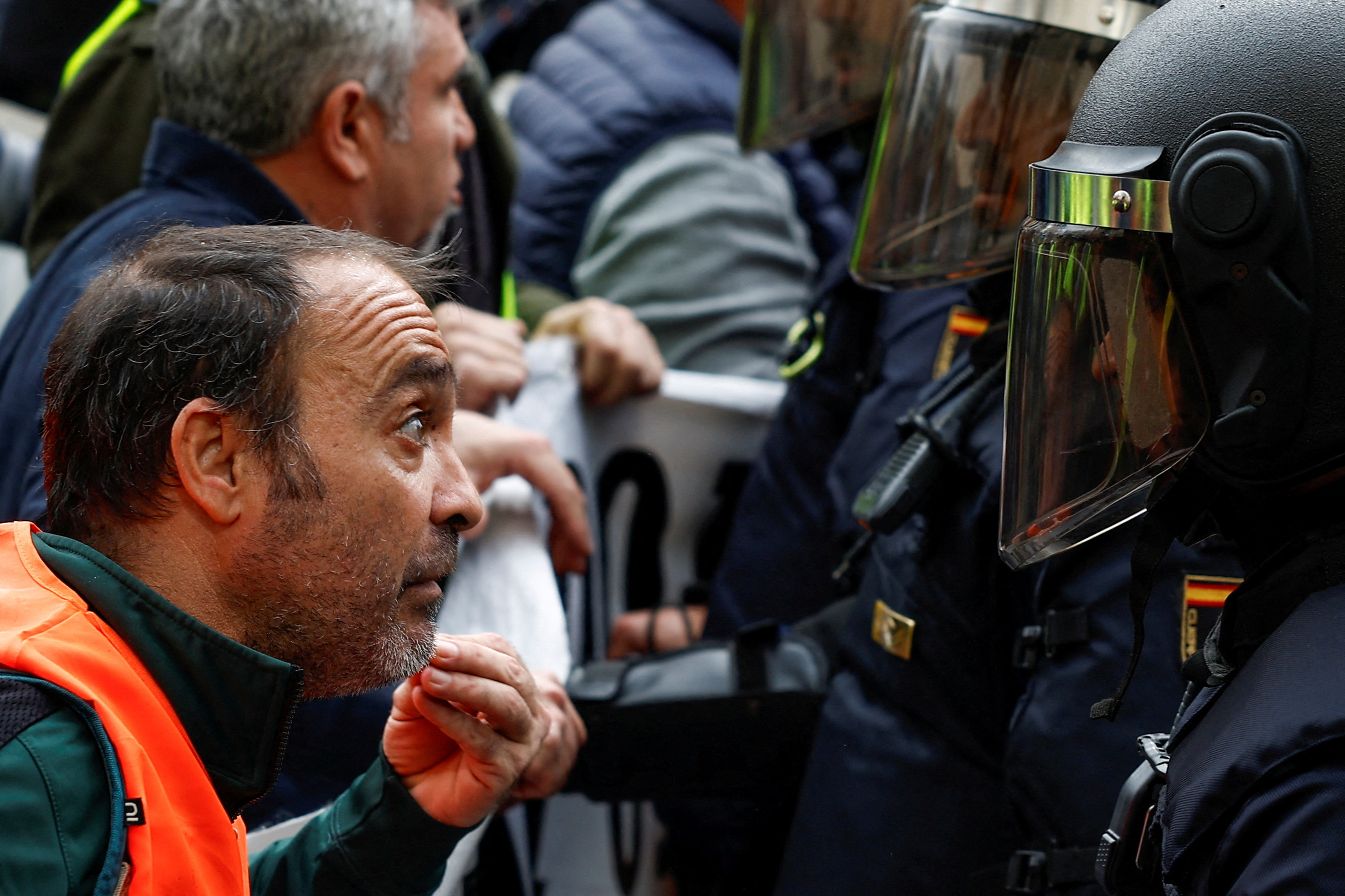 A protester confronts a police member as Spanish farmers protest over price pressures, taxes and green regulation, grievances shared by farmers across Europe, in Madrid, Spain, on February 21, 2024. (Photo by Juan Medina/Reuters)