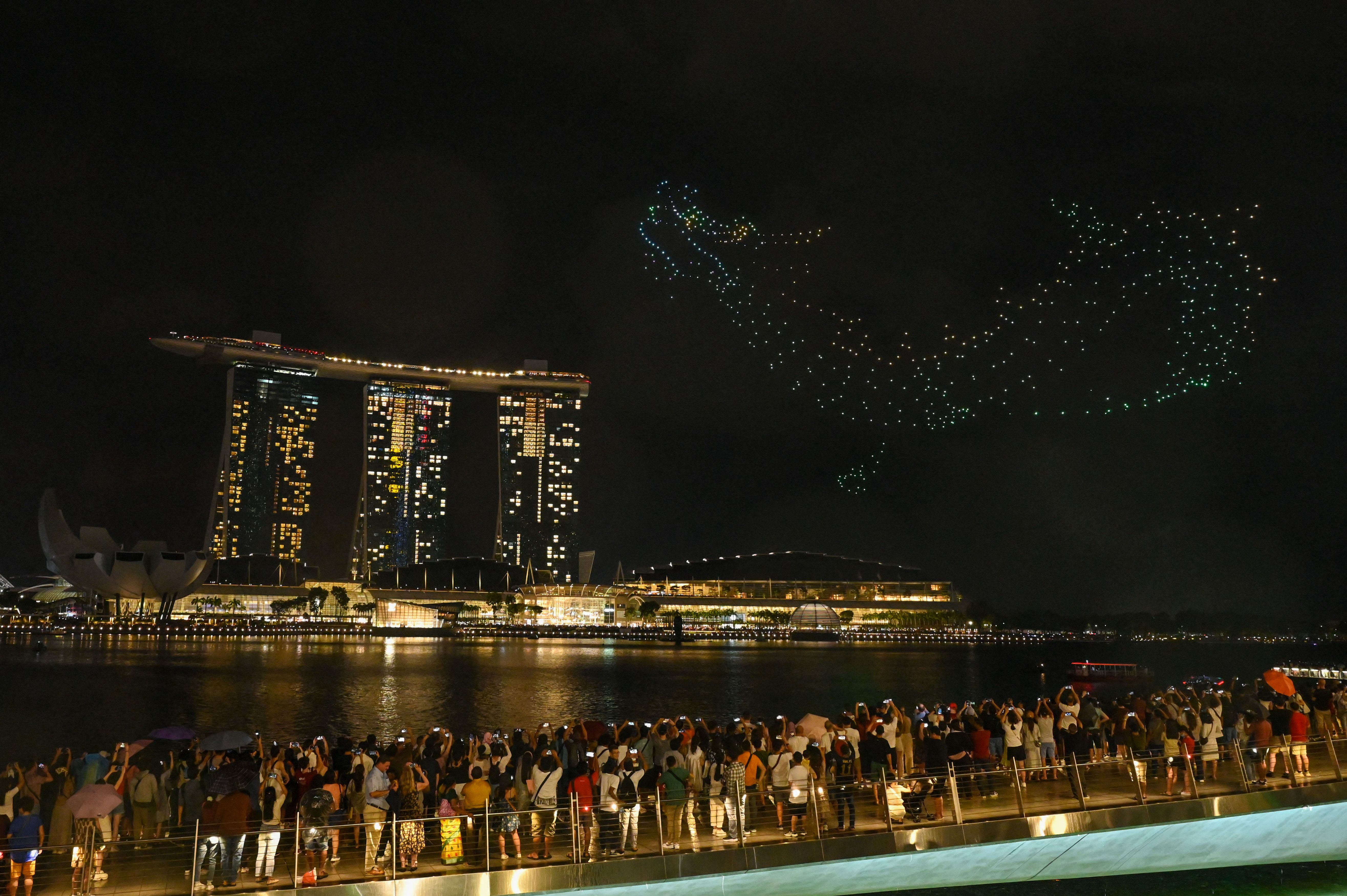 People watch some 1,500 drones forming a dragon during a performance titled 'The Legend Of The Dragon Gate' above the Marina bay waterfront on the first day of the Lunar New Year in Singapore on February 10, 2024. (Photo by Roslan Rahman/AFP Photo)