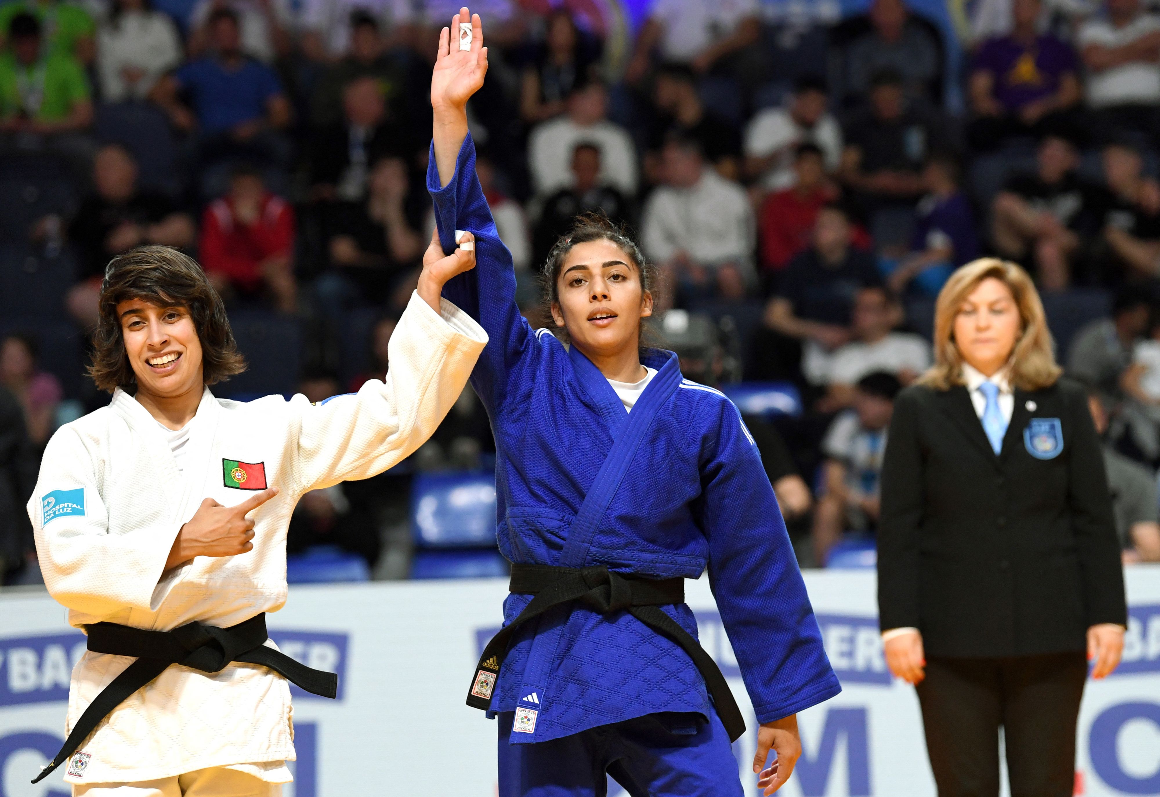 France's Shirine Boukli (Blue) and Portugal's Catarina Costa react in the women's -48kg final, at the Judo European Championships in Podgorica, Montenegro, on April 23, 2025. (Photo by Savo Prelevic/AFP Photo)