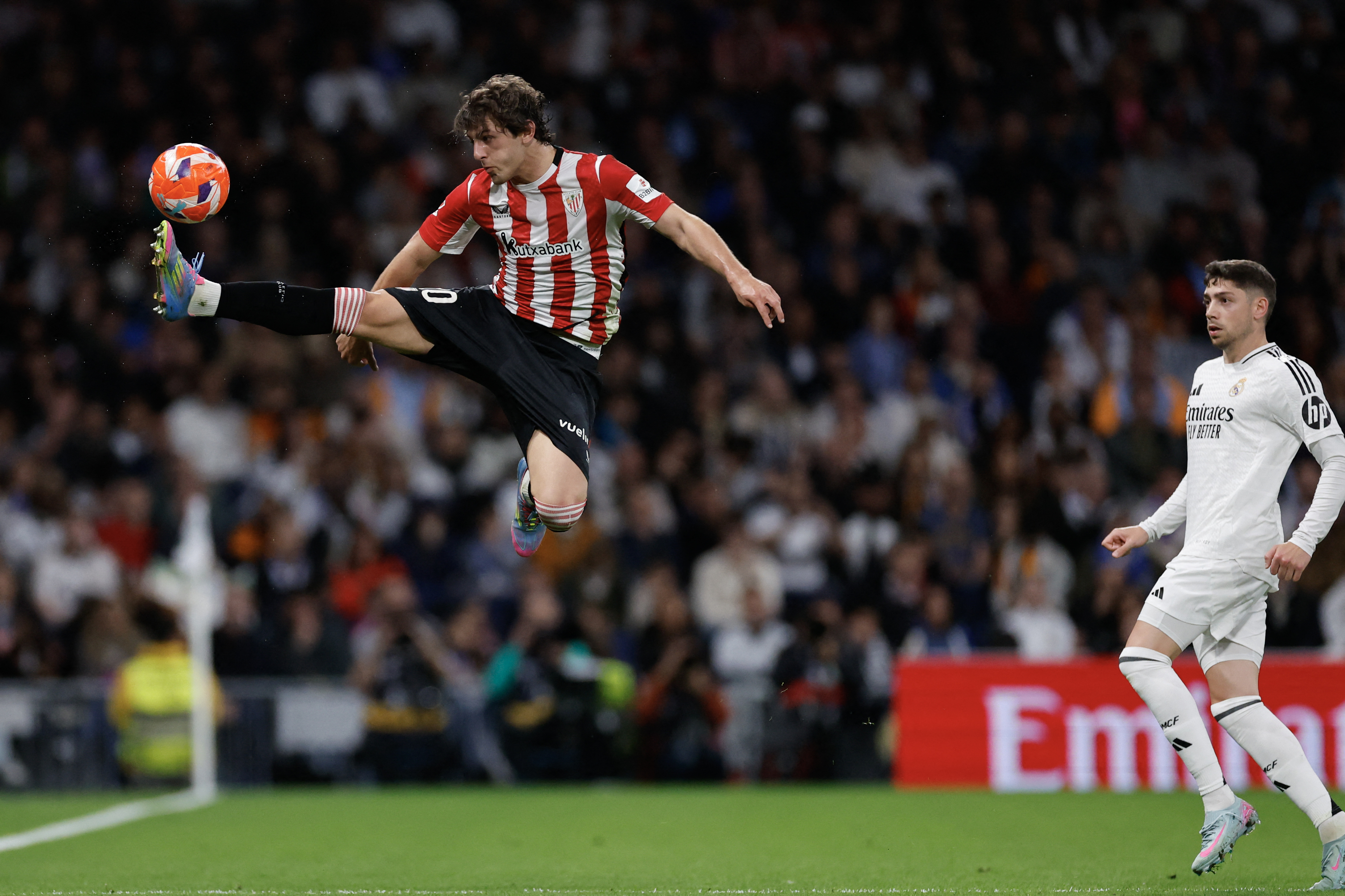 Athletic Bilbao's Spanish midfielder #20 Unai Gomez (L) controls teh ball as Real Madrid's Uruguayan midfielder #08 Federico Valverde looks on during the Spanish league football match between Real Madrid CF and Athletic Club Bilbao at the Santiago Bernabeu Stadium in Madrid, on April 20, 2025. (Photo by OSCAR DEL POZO / AFP)
