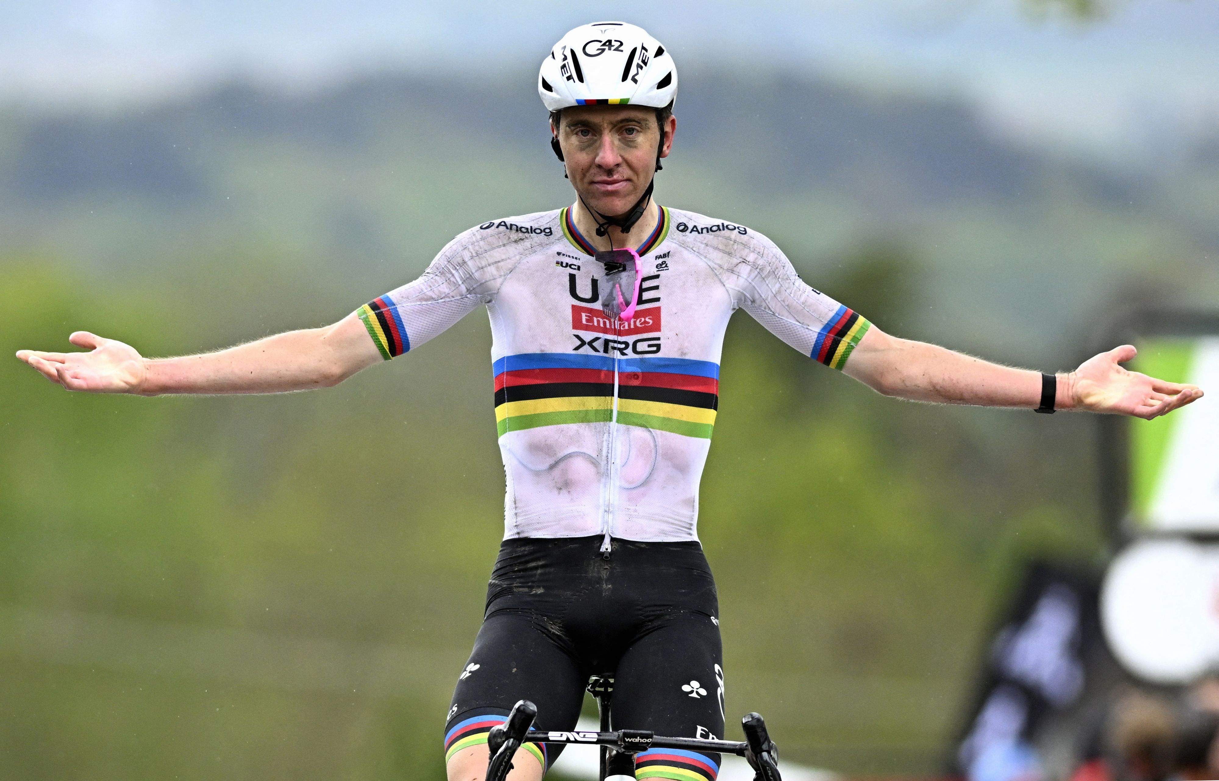 UAE Team Emirates' Slovenian rider Tadej Pogacar celebrates after winning the men's “La Fleche Wallonne” one day cycling race (Waalse Pijl - Walloon Arrow), 205,2 kms from Ciney to Huy on April 23, 2025. (Photo by Jasper Jacobs/Belga via AFP Photo)