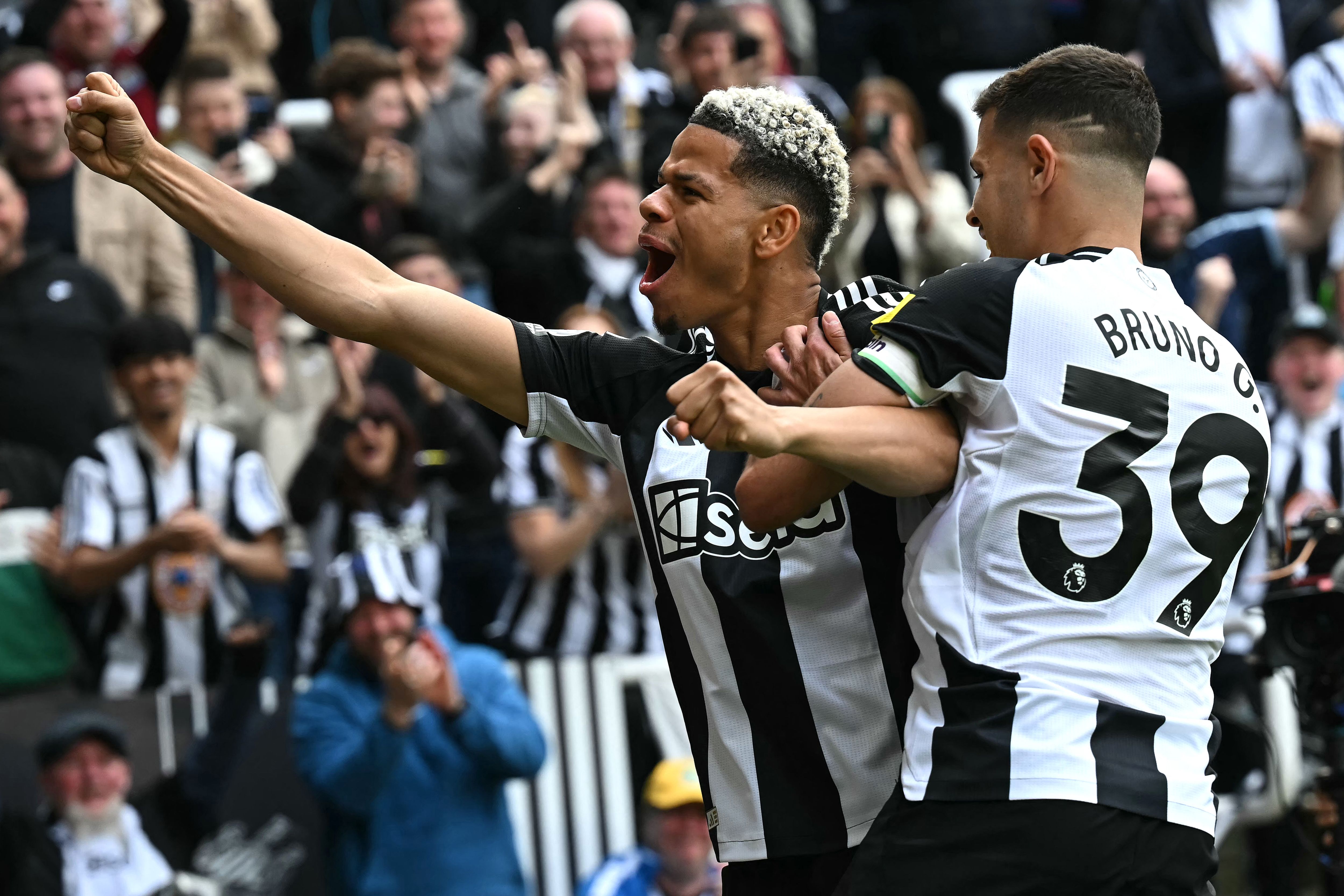 Newcastle United's Danish striker #18 William Osula (L) celebrates scoring the team's third goal with Newcastle United's Brazilian midfielder #39 Bruno Guimaraes during the English Premier League football match between Newcastle United and Ipswich Town at St James' Park in Newcastle-upon-Tyne, north east England on April 26, 2025. (Photo by Paul Ellis/AFP Photo)