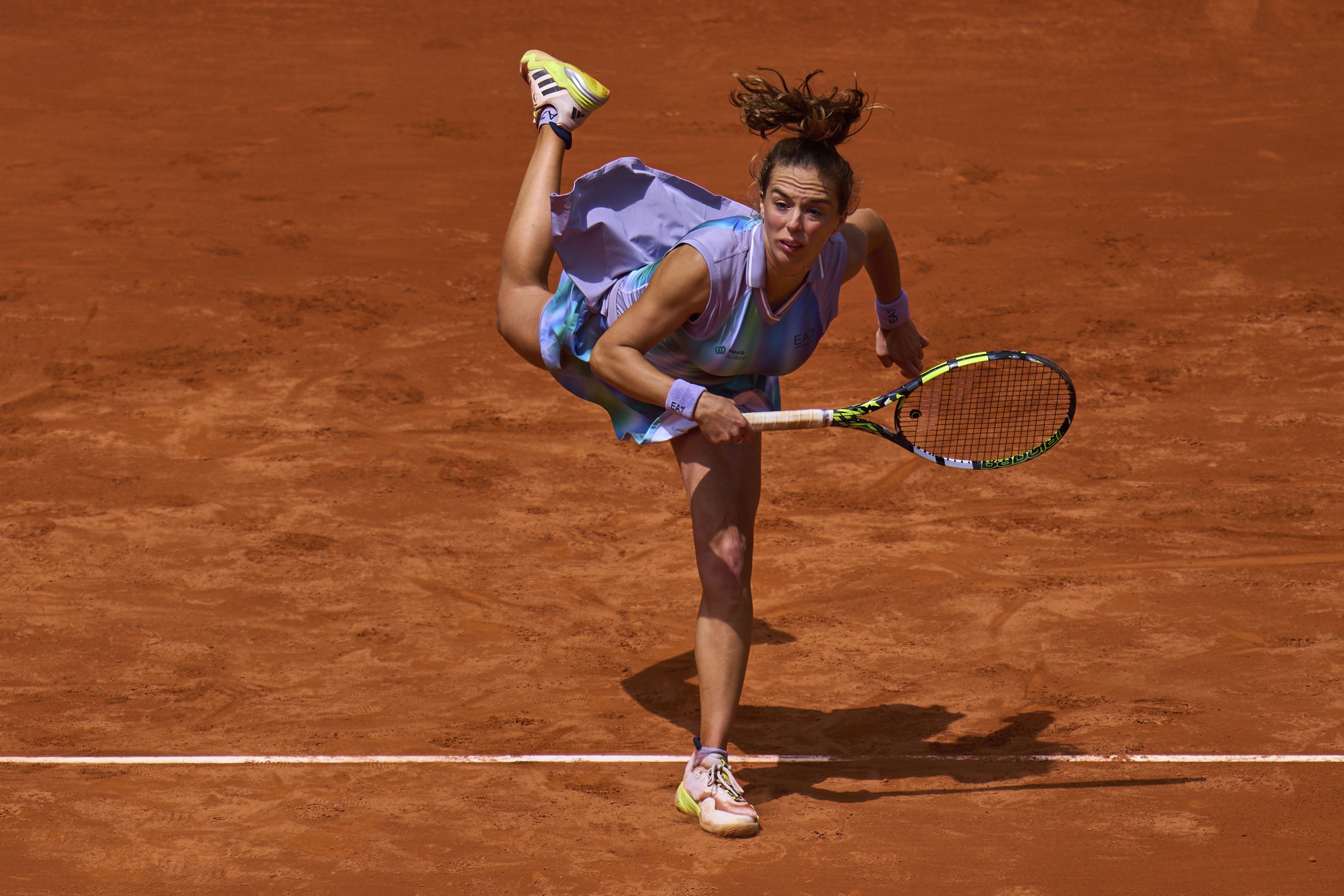 Lucia Bronzetti of Italy serves against Naomi Osaka of Japan during the Madrid Open tennis tournament in Madrid, Spain, Tuesday, April 22, 2025. (Photo by Manu Fernandez/AP Photo)