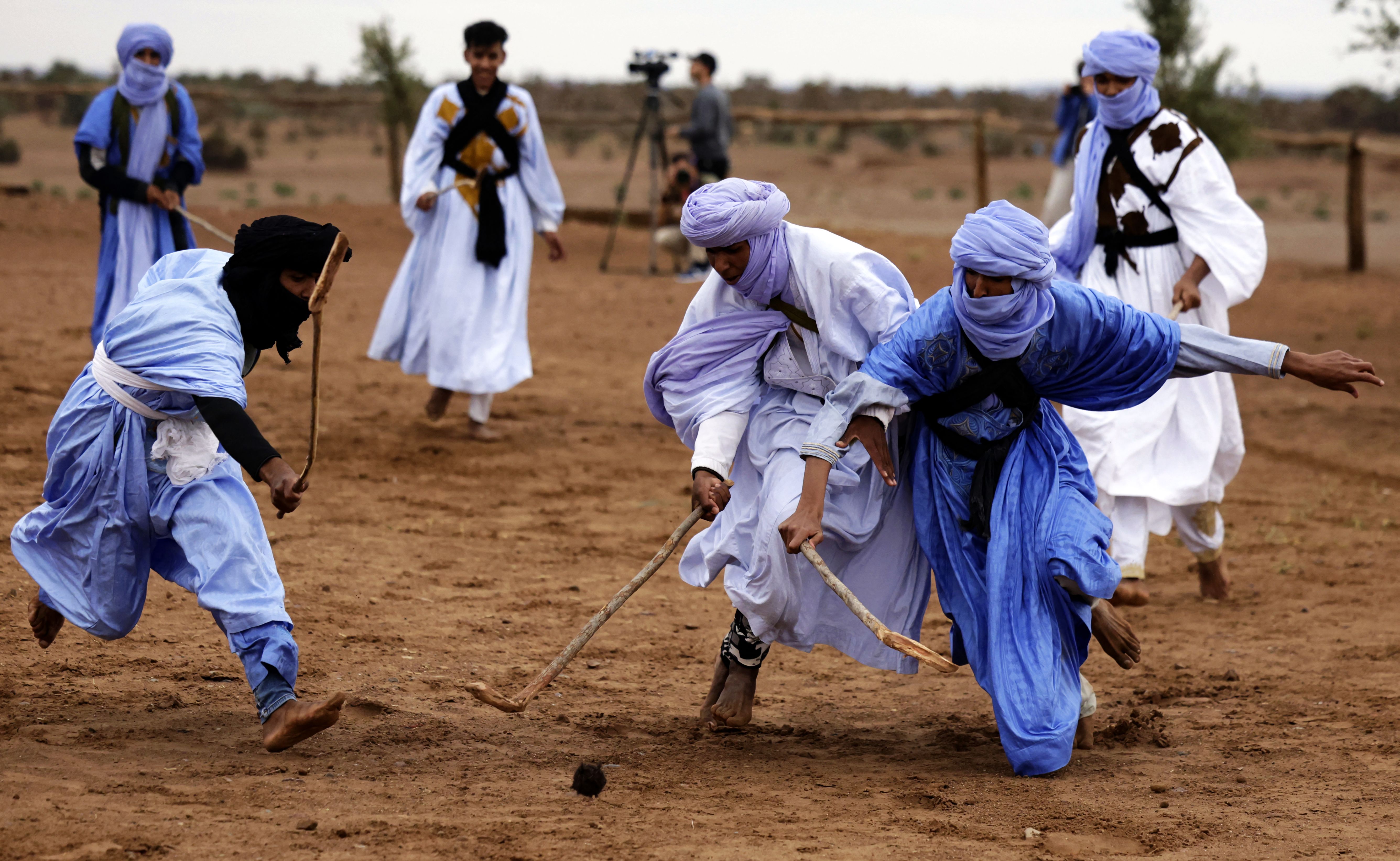 Moroccan nomads dressed in traditional garments take part in a sand hockey match during the Nomads Festival in Mhamid El-Ghizlane in Morocco's southern Sahara desert on April 12, 2025. (Photo by Abdel Majid Bziouat/AFP Photo)