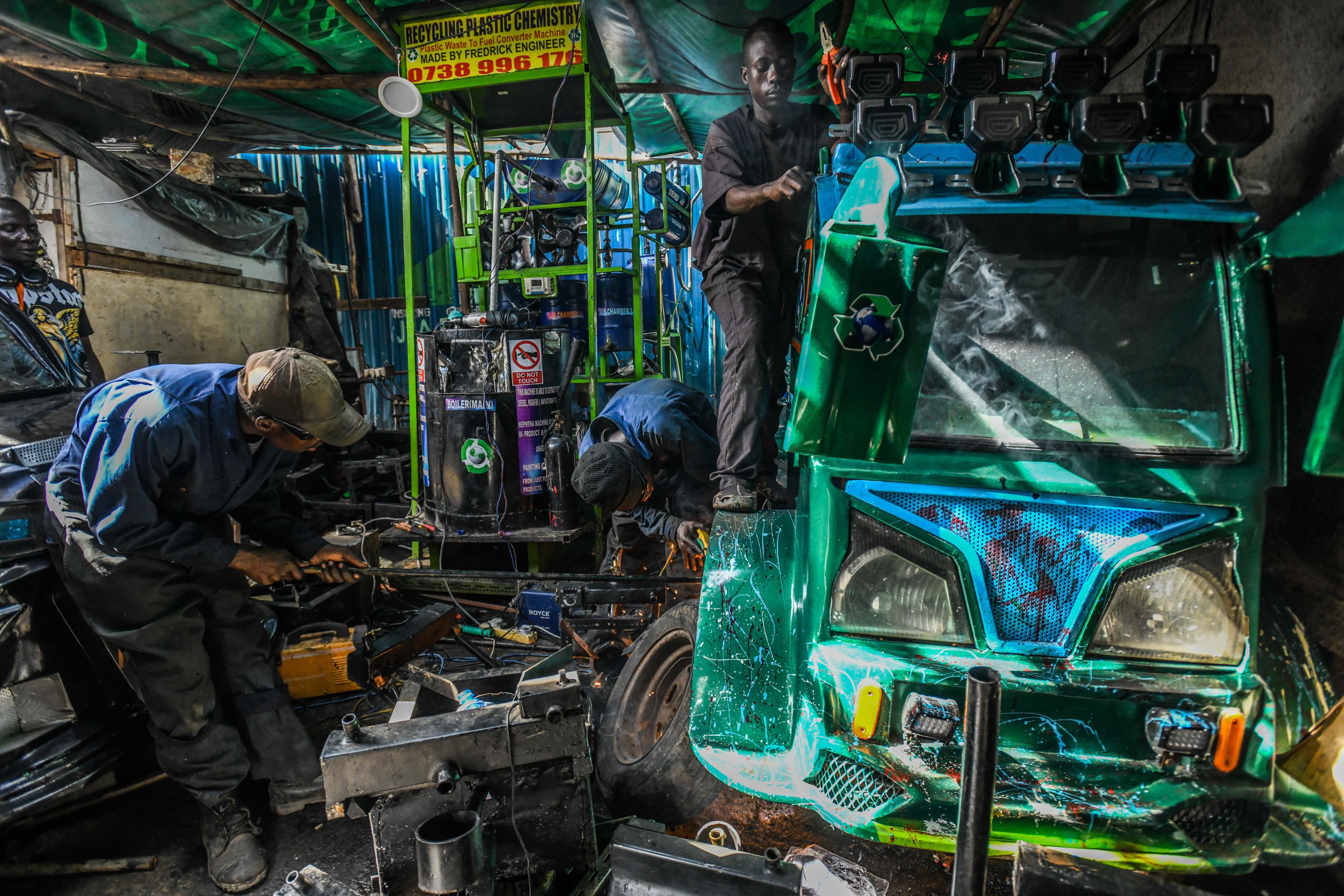 Young artisans transform scrap metal into modified vehicles, automated robotic units, and portable biomass stoves in Kariokor region of Nairobi, Kenya on April 12, 2025. The vocational training initiative, which involves around 30 youth, provides participants with a daily income of between 5 and 10 US dollars while helping them develop technical skills. The program also aims to prevent youth from turning to crime and substance abuse. (Photo by Gerald Anderson/Anadolu via Getty Images)