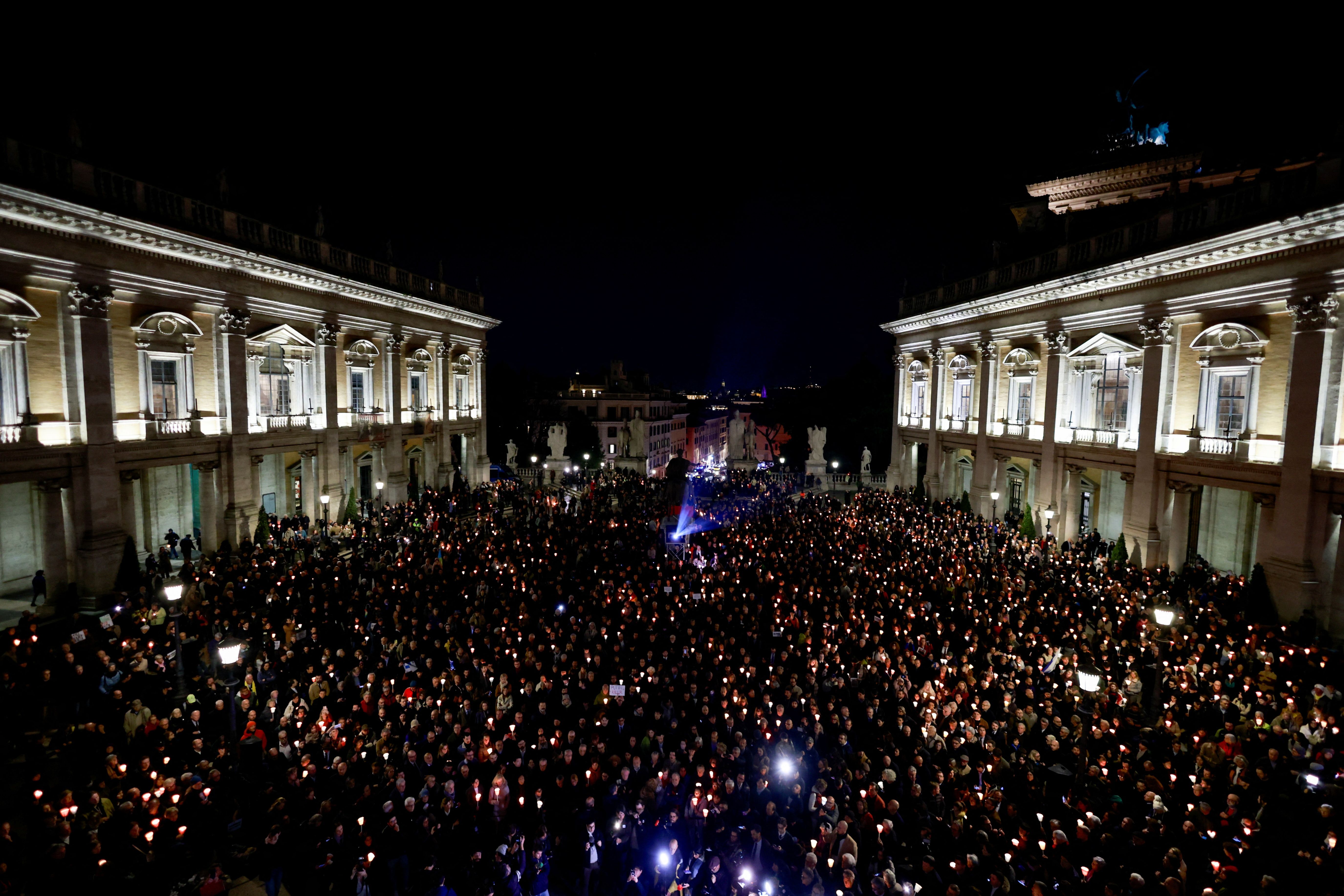 People hold candles as they attend a vigil in memory of late Russian opposition leader Alexei Navalny, at the Campidoglio (Capitoline Hill) in Rome, Italy, on February 19, 2024. (Photo by Yara Nardi/Reuters)