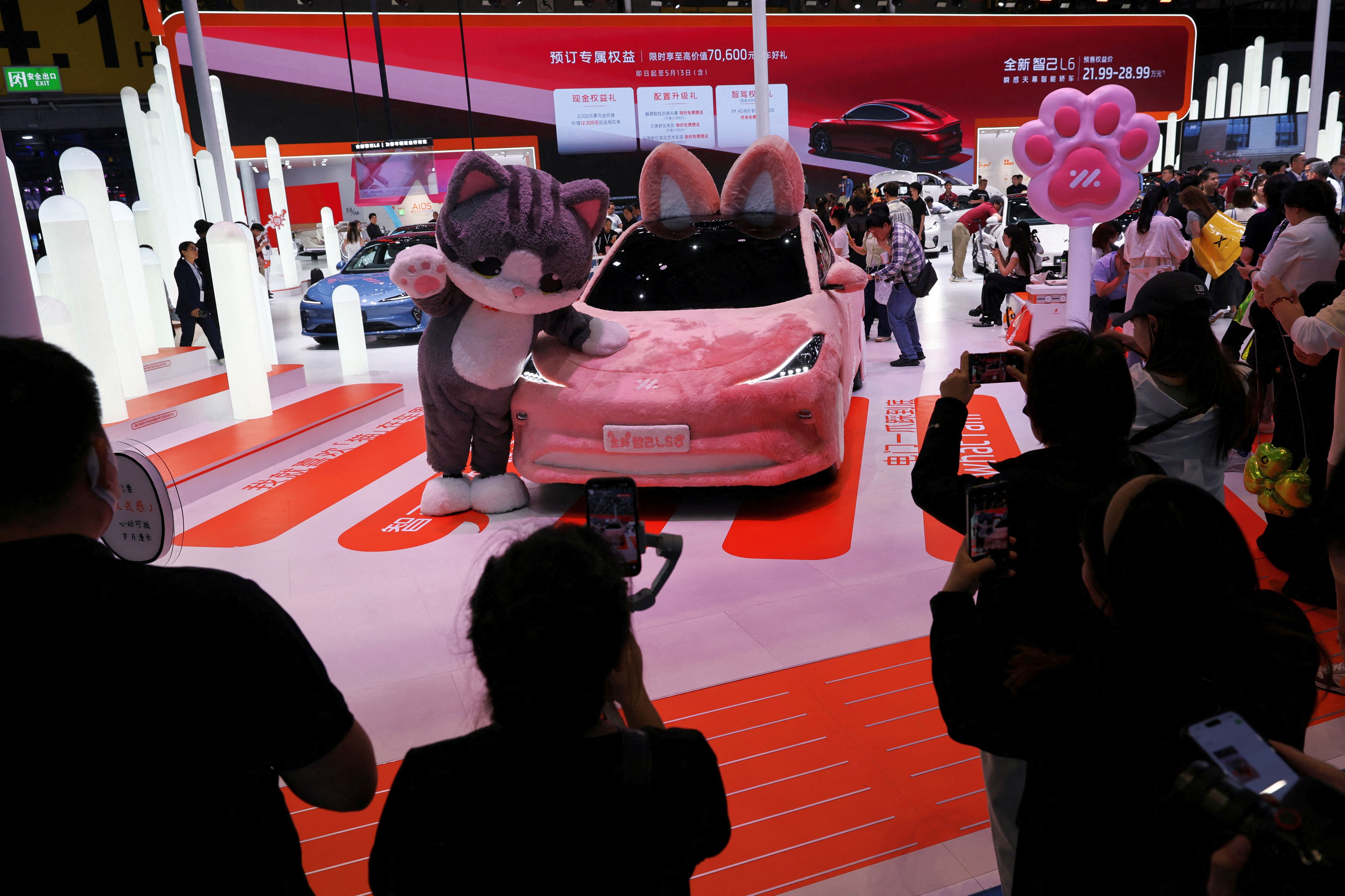 People take photos of a mascot and a concept car at the IM Motors booth during a media day for the Auto Shanghai show in Shanghai, China on April 24, 2025. (Photo by Go Nakamura/Reuters)