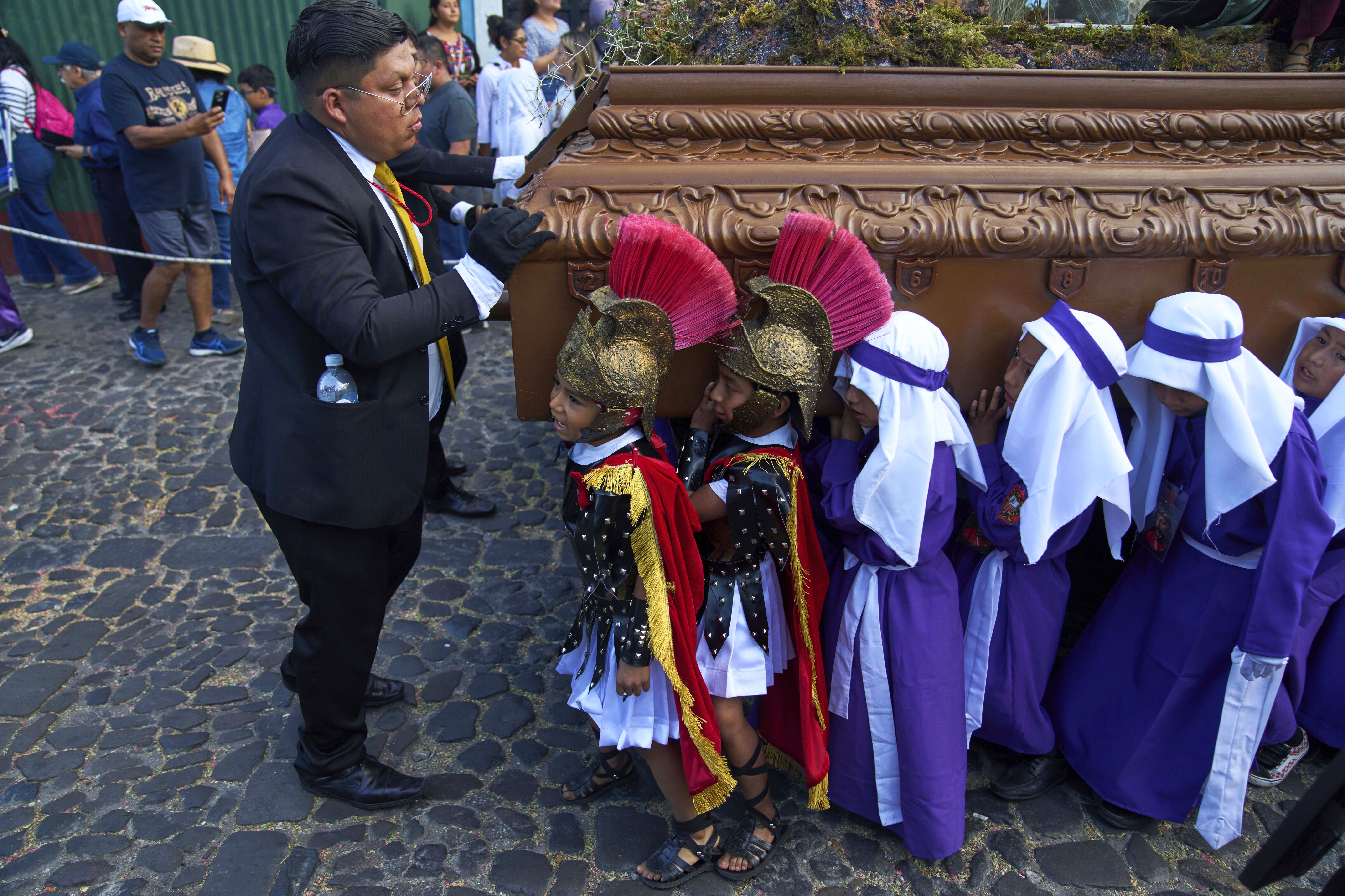 Children carry an image of Jesus Christ at a Holy Week procession in Antigua, Guatemala, Wednesday, April 16, 2025. (Photo by Moises Castillo/AP Photo)