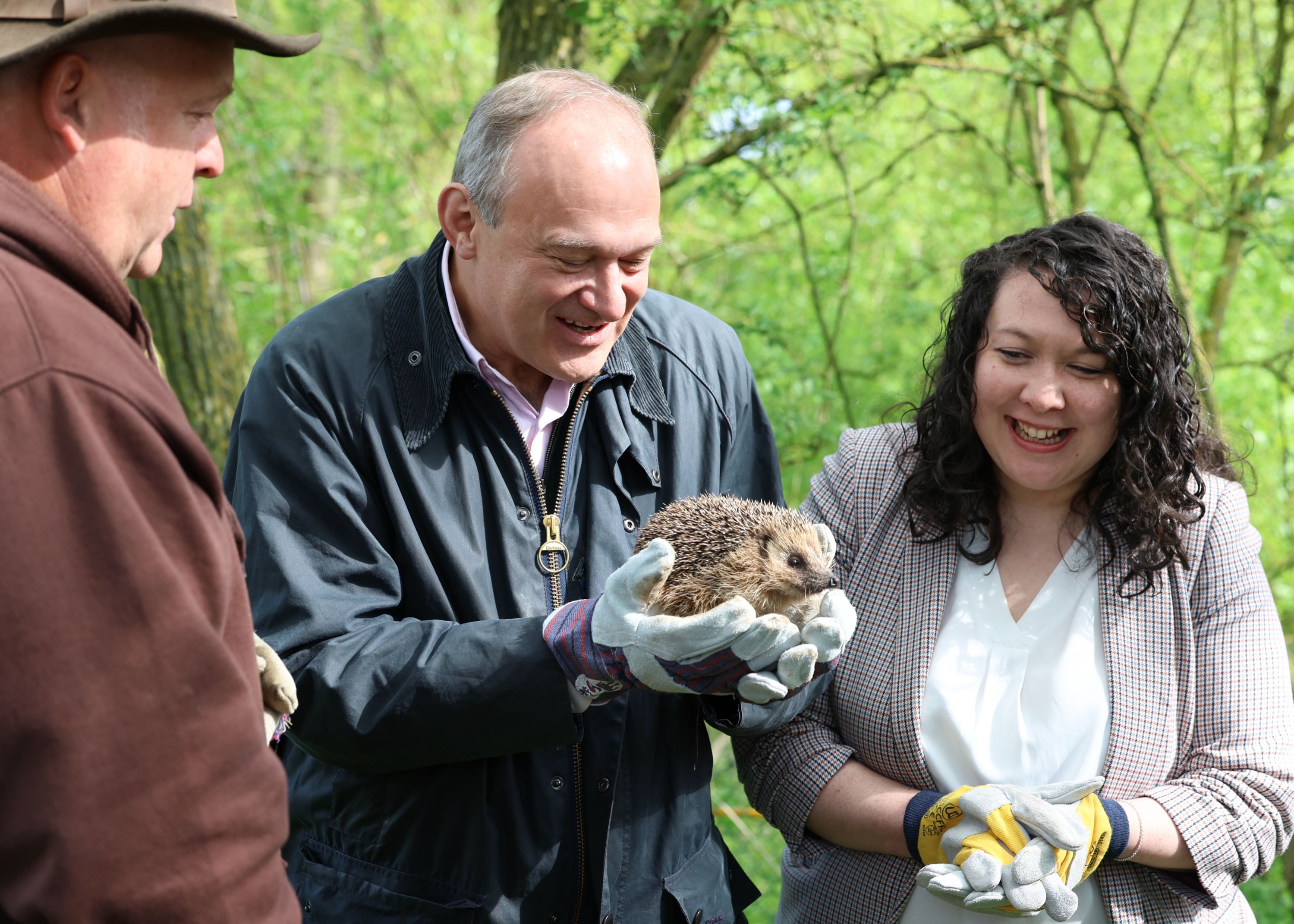 Liberal Democrat leader, Ed Davey, centre, with, Victoria Collins, Liberal Democrat MP for Harpenden & Berkhamsted, right, holds a hedgehog at the Hornbeam Hedgehog Sanctuary, in Harpenden, left, Martin Maylin, owner and manager of the sanctuary, as Ed Davey campaigns for local elections in Hertfordshire, UK on April 25, 2025. (Photo by Jacqueline Lawrie/London News Pictures)