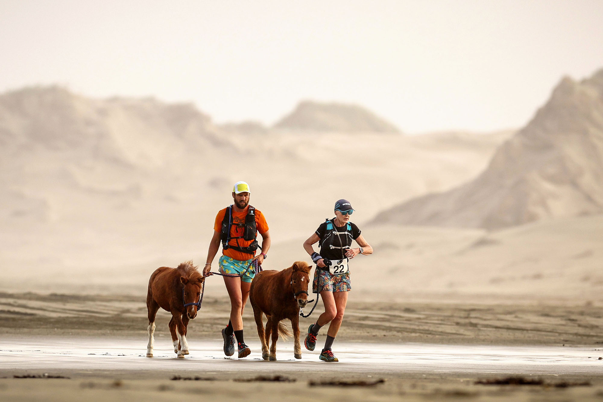 Ben Wilkes leading Gucci (L) and Diane Livingston leading Vivienne run along 90 Mile Beach during the final day of the the Great North Gallop on April 21, 2025 in Houhora, New Zealand. Set against the breathtaking backdrop of Northland's wild beaches and dense forests, the Born to Run Great Northern Gallop is a one-of-a-kind 100km multi-day adventure race where participants run or walk alongside spirited miniature ponies. Each day covers 25km across terrain rarely open to the public, with runners and their tiny equine partners navigating stretches of the iconic 90 Mile Beach and remote wilderness, all while wild horses may be glimpsed roaming free. Evenings are spent camping near the coast, fostering camaraderie under the stars, and every team—whether seasoned athletes or families—receives training and support, ensuring both runners and ponies are cared for. Chloe Phillips-Harris organises the annual event to raise funds for the welfare of miniature horses in her care. She rescues and rehabilitates at least 15 ponies a year and takes them from crippling lameness, starvation and neglect to running 100km over four days. Chloe says the event takes people out of their comfort zone and shows how robust and capable these horses can be. (Photo by Fiona Goodall/Getty Images)